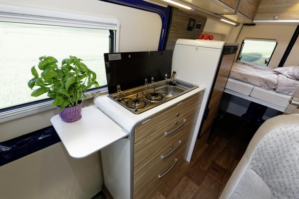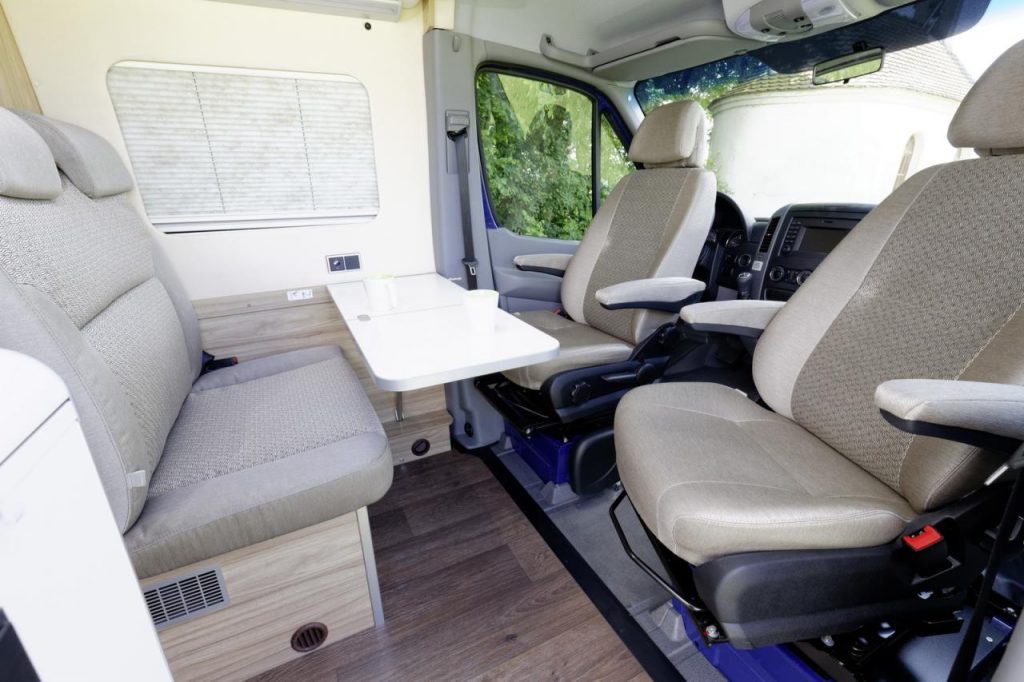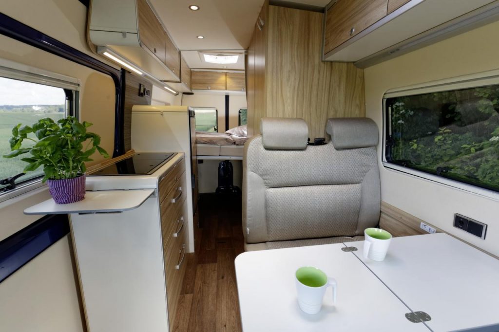 Les images ci-dessous permettront de découvrir plus en détails tous les équipements des Hymercar Grand Canyon S et Vansportscamper entre kitchenette, ameublement, lits, banquette convertible, sièges pivotants, salle de bain, éclairage d’ambiance, tiroirs de rangements, tablette, couchettes, table de camping et chaises, etc, etc.