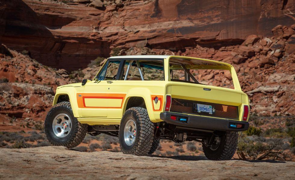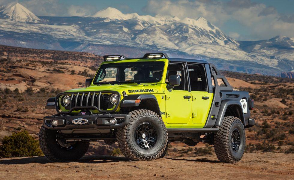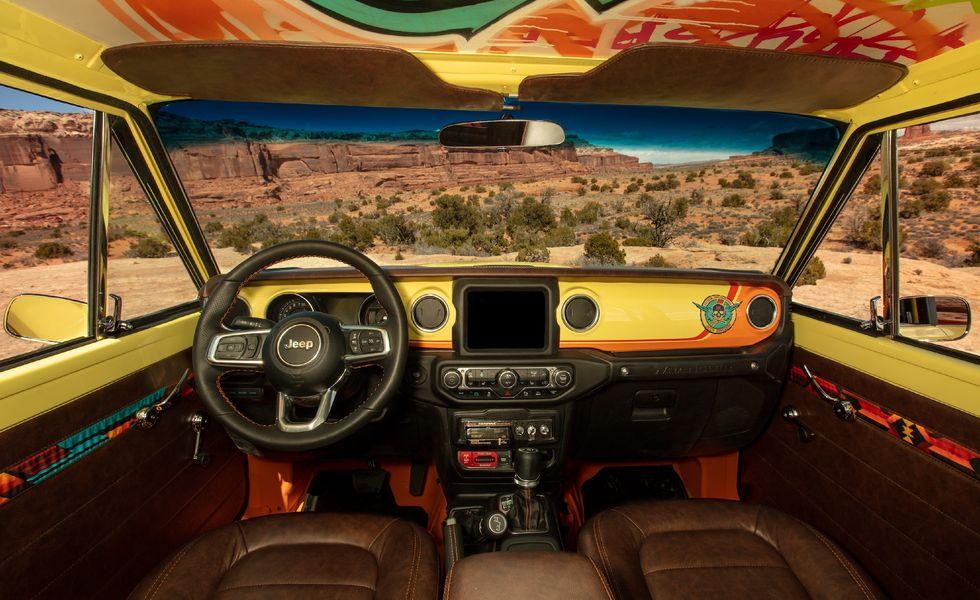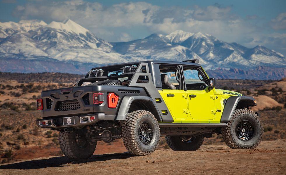 Le Sideburn est peint en Solar Flash Yellow, il sera donc difficile de ne pas le repérer sur les sentiers. Jeep l'a également équipé d'un ensemble de pneus tout-terrain de 37 pouces et de roues de 17 pouces, et une roue de secours pleine grandeur est montée sur le porte-pneu modifié dans la boîte. La barre sport innovante qui s'arque sur le dos est faite de fibre de carbone et d'acier et intègre des marches des deux côtés.