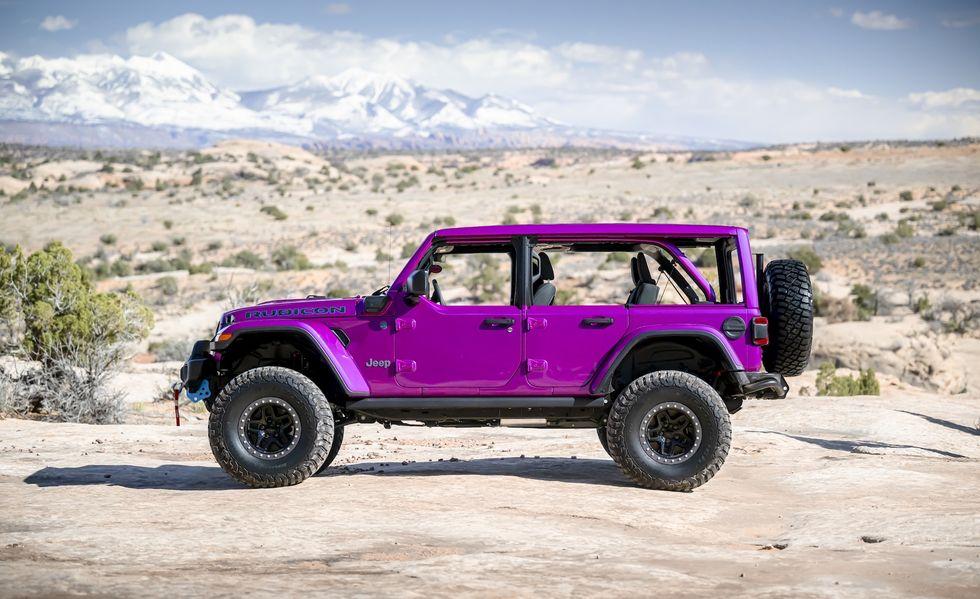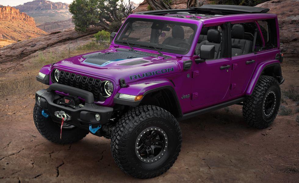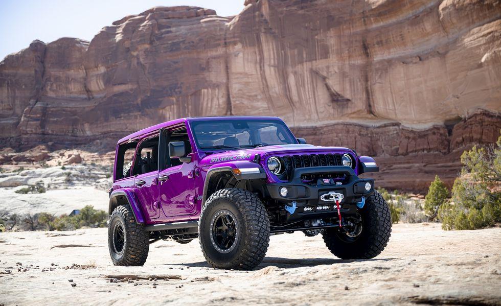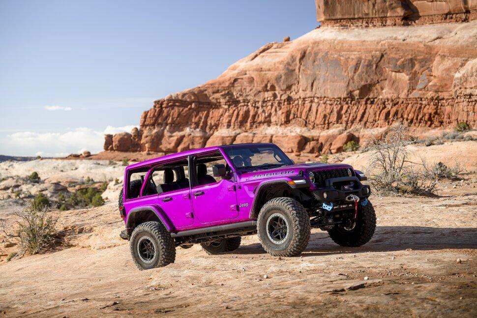 Tout d'abord, le Wrangler Rubicon 4xe. Non, rien de spécial n'a été fait pour le groupe motopropulseur ou le système à quatre roues motrices, mais il vient avec un travail de peinture plutôt festif. Jeep a été submergé par le support de l'édition rose qu'ils ont apportée il y a quelques Safaris, alors cette année, ils apporteront une version magenta.