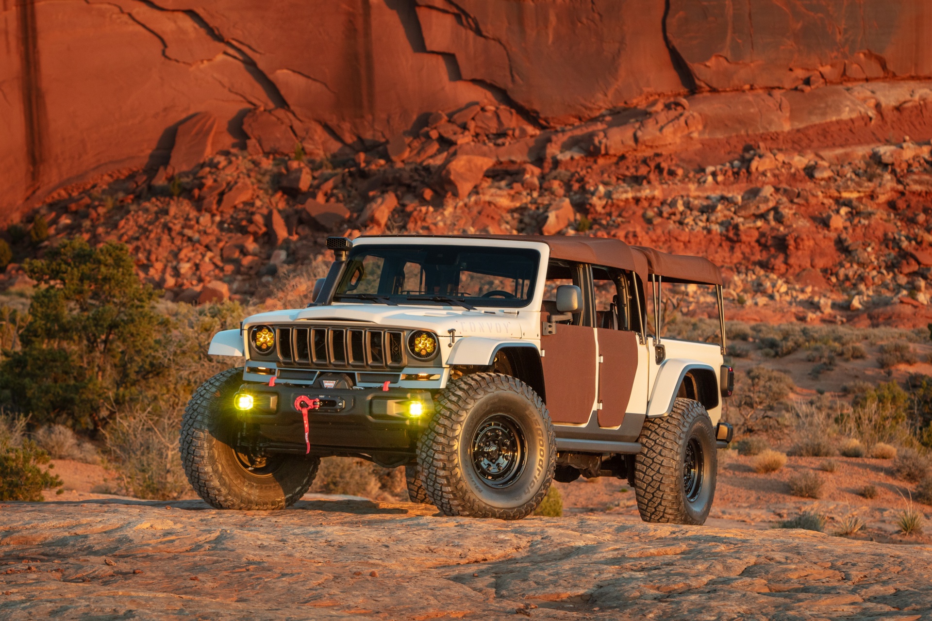 Avec son allure à mi-chemin de l’engin militaire, que confirme son nom, le Jeep Convoy montre aussi que le Wrangler n’est pas la seule Jeep qui mérite d’être évoquée. Basé sur le Gladiator, il hérite d’une face avant très inspirée par le Gladiator original, le Gladiator SJ des années 60, et qui dérivait du SUV Wagoneer (En 1972, le Gladiator est devenu simplement Jeep Pick-up ou Jeep J10 / J20).