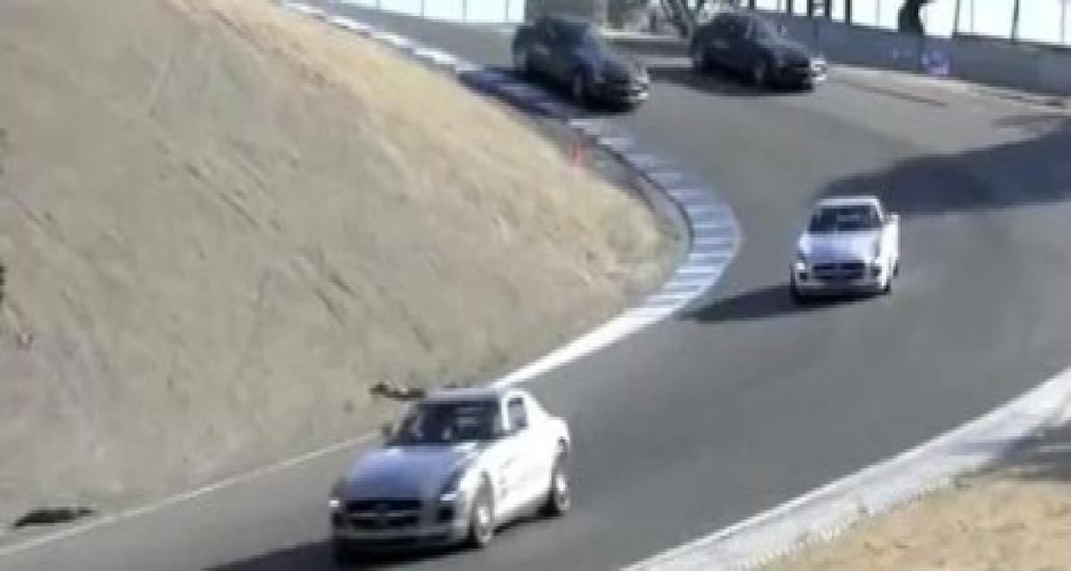 Depuis sa présentation au salon de Francfort, la nouvelle Mercedes SLS AMG s’est imposée comme base de choix de certains tuners et autres préparateurs. Je ne peux m’empêcher d’en placer une petite pour la déclinaison dévoilée, virtuellement respirons, par MEC Design aussi vulgaire que pataude. Bref. Mais la SLS AMG à la base c’est par exemple un V8 6.3 l AMG de 571 ch et des performances à couper le souffle pour un comportement qu’on imagine bien volontiers joueur en bonne supercar qu’elle est. Justement grâce à Mercedes on peut en voir, et entendre, davantage après que la descendante de la 300 SL Gullwing a limé le circuit de Laguna Seca.