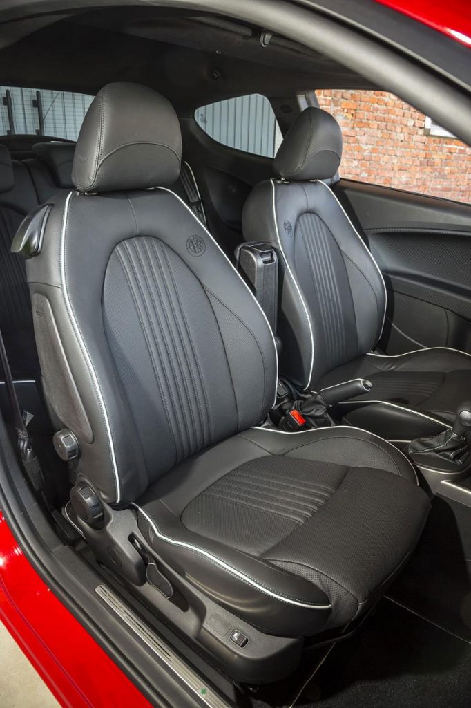 L’habitacle reçoit un traitement façon carbone pour la planche de bord et quelques touches des couleurs du trèfle sur les surpiqures. Le ton sport sera surtout confirmé avec le recours au catalogue des options pour les baquets Sabelt à coque en carbone, qui s’avèreront peut-être superflus.