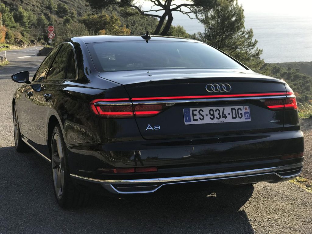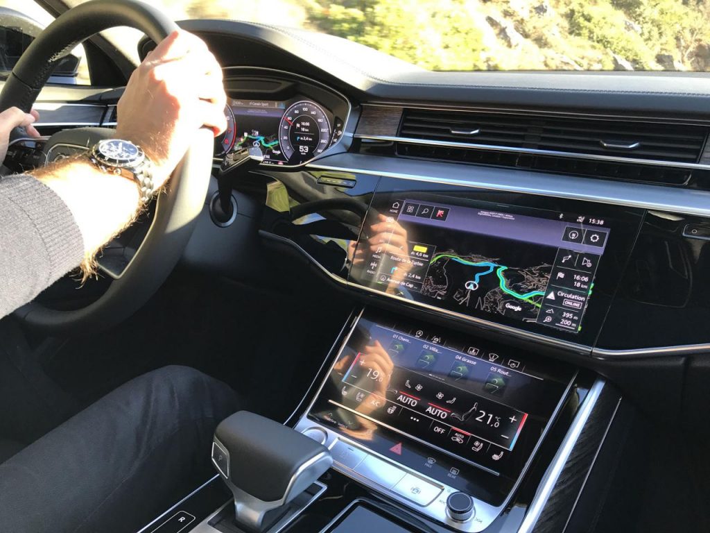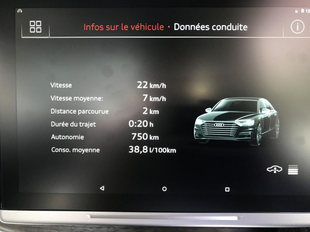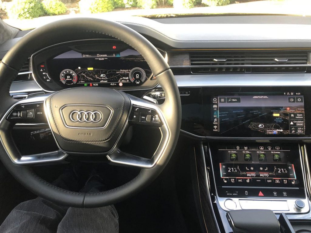 On exagère à peine, car cette A8 adopte suivant les pays, la conduite autonome de niveau 3. Elle peut ainsi se passer de votre vigilance sur les voies à chaussée séparées notamment. Comme Mercedes, comme BMW, on fait sensation en télécommandant ce vaisseau pour entrer ou sortir de son emplacement de parking, depuis l’extérieur. Voici un nouveau point de discussion au moment du café entre professionnels devant les établissements de luxe, qui n’exclut plus les chauffeurs d’Audi A8.