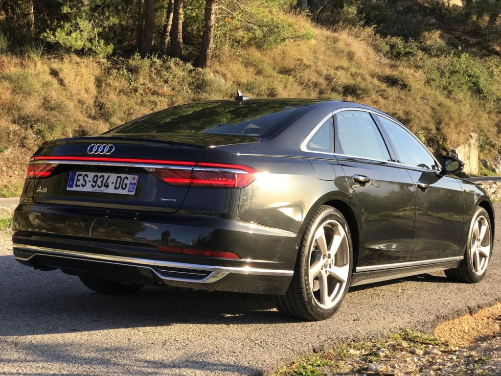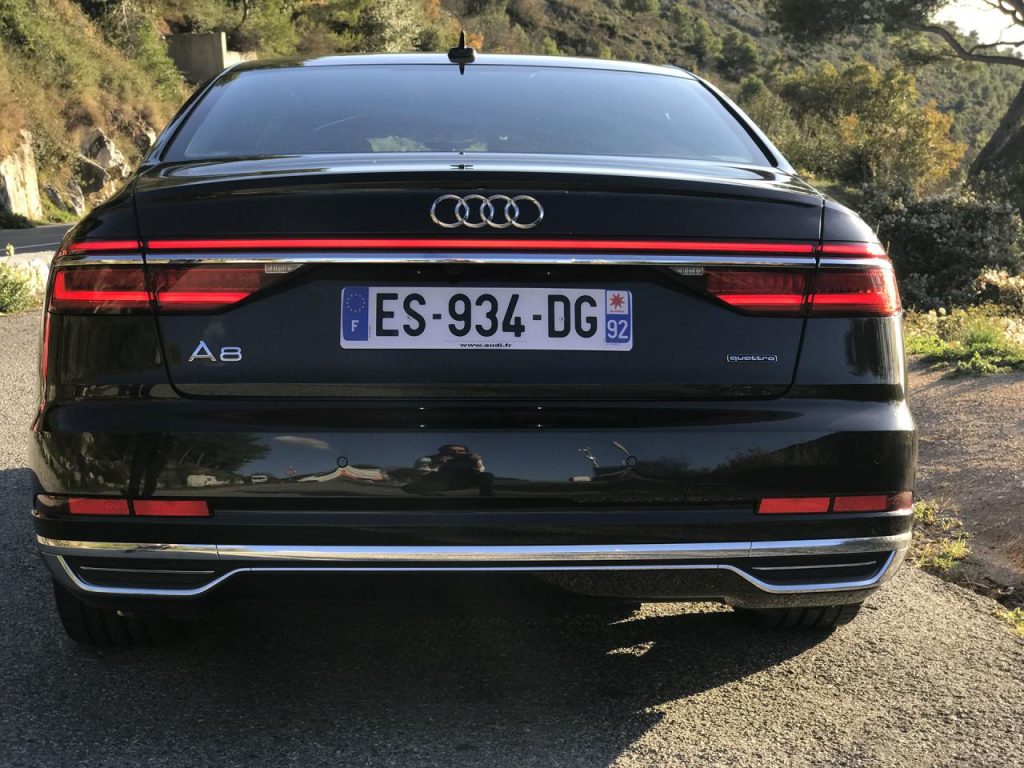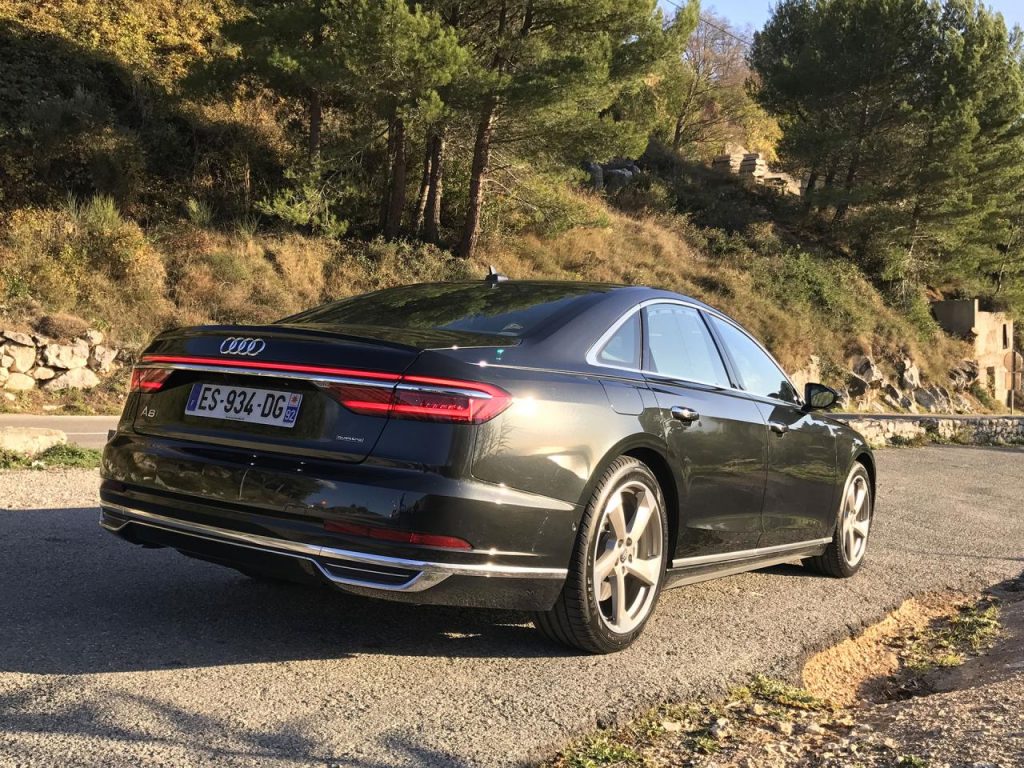 Globalement, la silhouette de l’Audi A8 évolue peu, mais on remarque immédiatement les détails qui marquent la personnalité de cette grande berline. L’animation des feux Matrix à l’avant et à technologie OLED à l’arrière relève du spectacle lumineux. Soyez en sûr, on ne vous ratera pas chaque fois que vous entrerez dans votre A8. De quoi rivaliser avec les plus sophistiquées décorations de Noël des palaces.