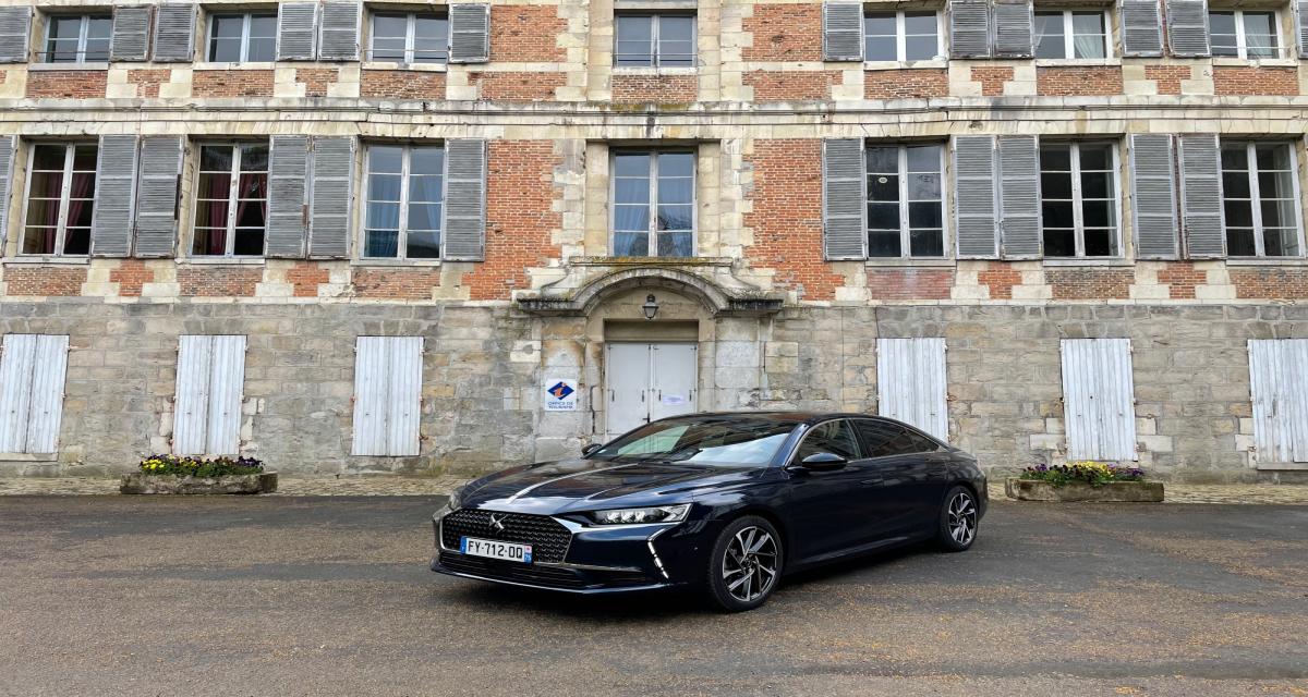 DS nous accueille avec ce message concernant la nouvelle DS9 : La puissance de l’élégance. Le lieu de réception prestigieux où nous nous trouvons surplombe les vignes, avec une vue imprenable sur Épernay. La voiture se fond assez bien dans le décor. Son design plutôt classique au premier abord, ne la distingue pas trop de ce qui se fait déjà. Mais DS se démarque dans les détails. A l’avant, la large calandre brillante reçoit le logo de la maison. Les phares aux éléments internes pivotants, font leur petit effet au démarrage.