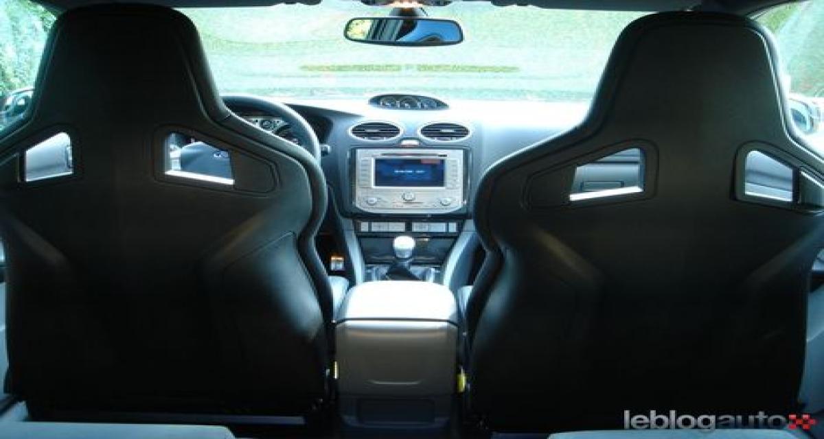 Pour le reste, l’habitacle appelle assez peu de critiques. Les matériaux ne sont pas trop mauvais, hormis le couvercle de boîte à gants d’un plastique peu flatteur et les inserts en faux carbone qui ne seront pas du goût de tous. Les manomètres qui trônent sur le sommet de la planche de bord rappellent que la vertu principale de la Focus RS est le sport. Donc assez parlé, il est temps de s’attacher… Si vous y arrivez ! La ceinture étant placée très loin en arrière et les rebords des baquets faisant leur travail, il est en effet bien difficile d’attrapper cette fichue lanière de survie. Surtout que les Recaro ne présentent pas de guide ceinture. Bref après deux torticolis, vous finissez par connaître le mouvement. Si vous faites de l’arthrite (de Russie), ce sera plus difficile…