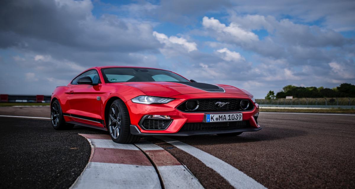 Sous un soleil de septembre encore radieux, on remarque immédiatement la demi-douzaine d’exemplaires rutilants qui nous attendent dans le paddock. Nous jetons notre dévolu sur la rouge, avec son large bandeau noir sur le capot. Au bout de ce dernier, l’inscription « Mach 1 ». La calandre intègre deux ronds noirs, un clin d’œil à l’une de ses aïeules. L’ensemble des petits détails esthétiques se complètent d’un becquet de malle, et d’un diffuseur percé par deux énormes sorties d’échappement. Question look, elle en jette !
