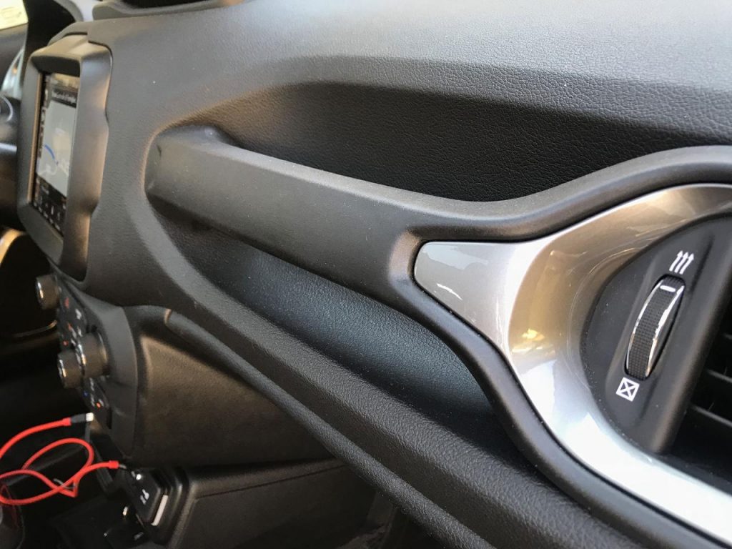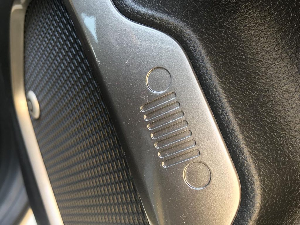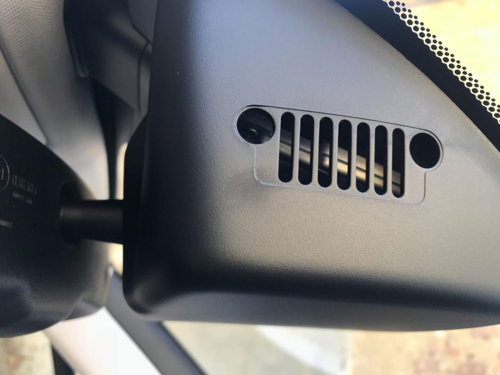A bord, ce qui change le plus ne se voit pas. Avec la poignée imposante devant le passager, là aussi on se croit dans l’univers du franchissement. On apprécie toujours autant les détails de design, avec la calandre Jeep sur le support du rétroviseur intérieur, sur les grilles d’enceinte ou dans le fond du vide-poche central. Et le plus beau clin d’œil se situe à la base du pare-brise, avec une silhouette de Willys.