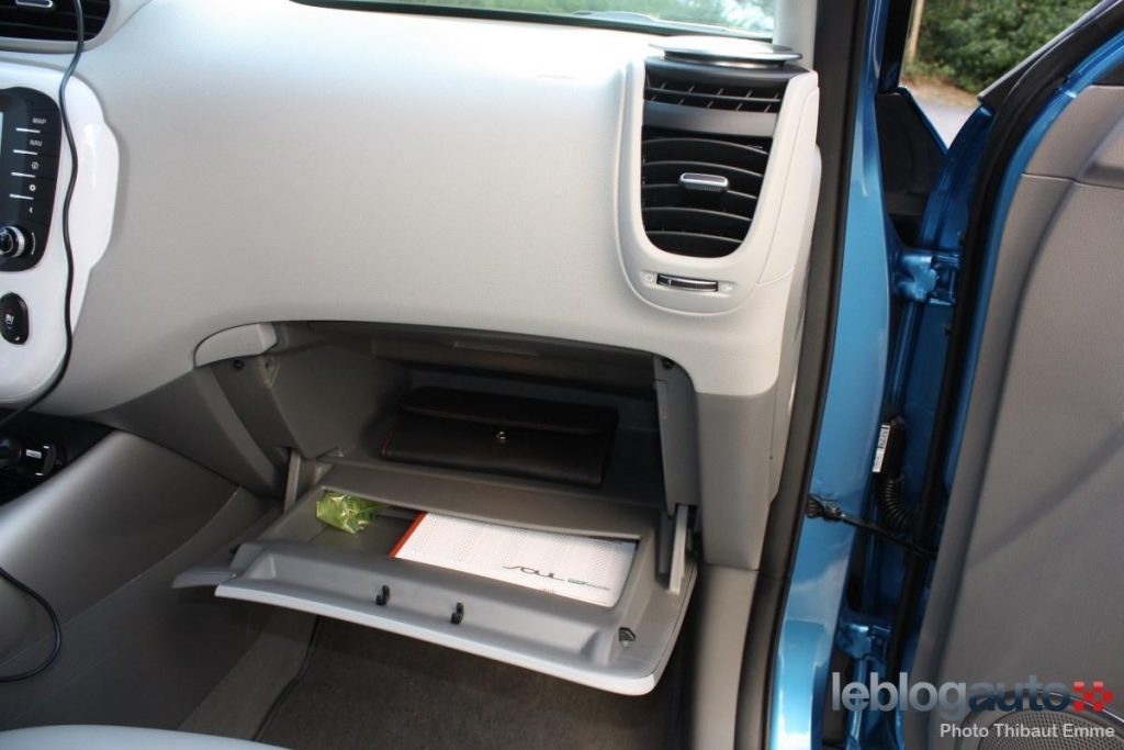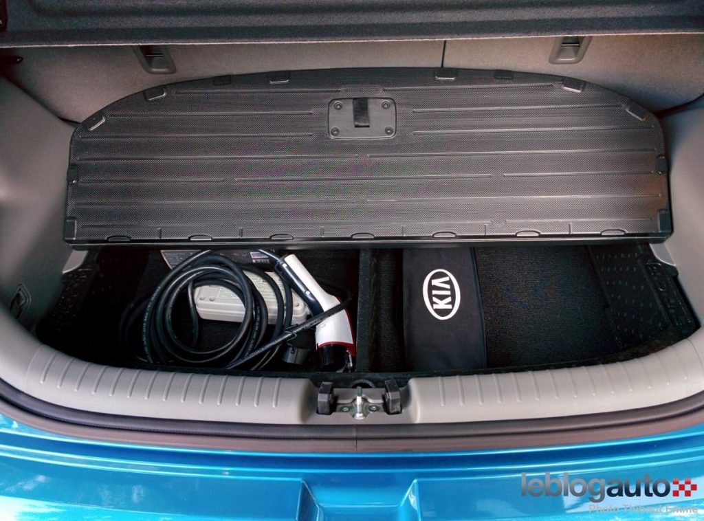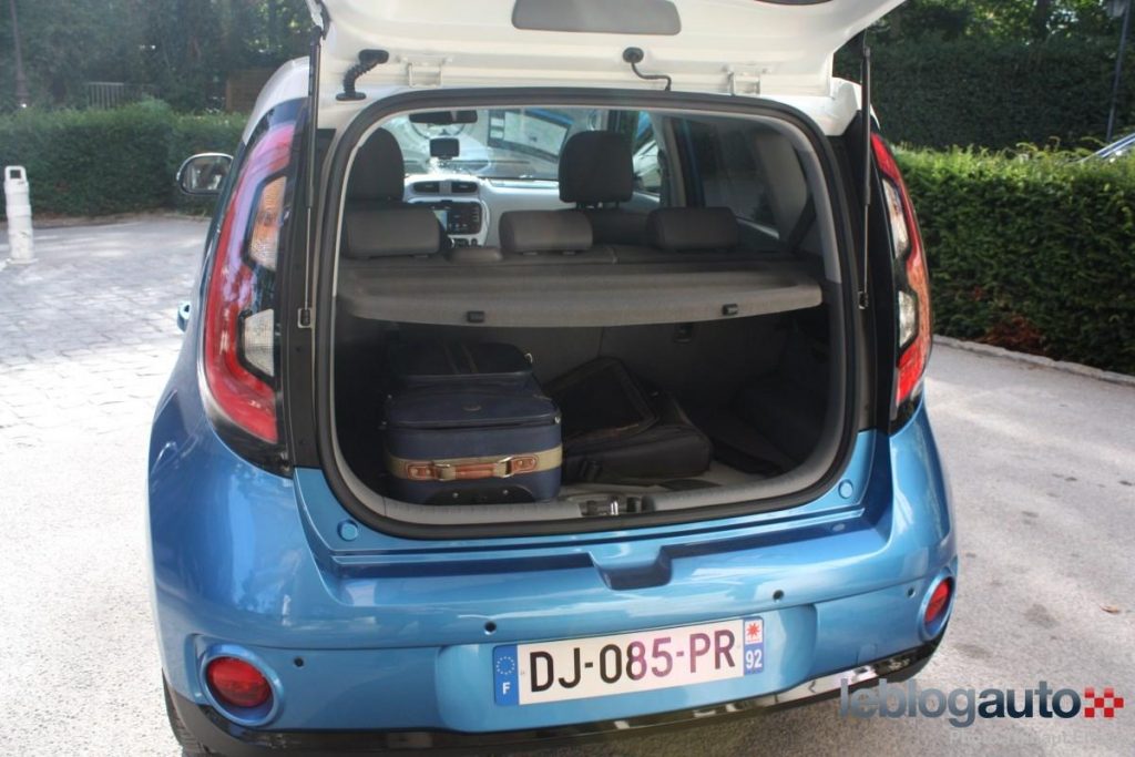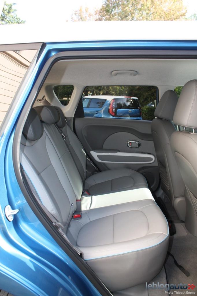 Côté habitabilité, le Soul EV conserve l’essentiel de la version thermique mais a obligé Kia à quelques transformations. Le positionnement des batteries sous le plancher fait perdre 80 mm de longueur aux jambes aux places arrières mais une banquette arrière plus creusée permet aux passagers de se sentir tout de même à l’aise. La grande garde au toit y est aussi pour beaucoup. Quelques rangements sont dissimulés dans les portières ou devant le levier de vitesse. La boîte à gants a un volume correct mais n’a pas de parois latérales, et les choses contenues pourront aisément verser dans un virage quand elle est ouverte. A noter que le coffre perd en capacité avec 281 litres seulement contre 340 en version thermique. A titre de comparaison, la Nissan Leaf propose 355 litres et la Renault Zoe 338.