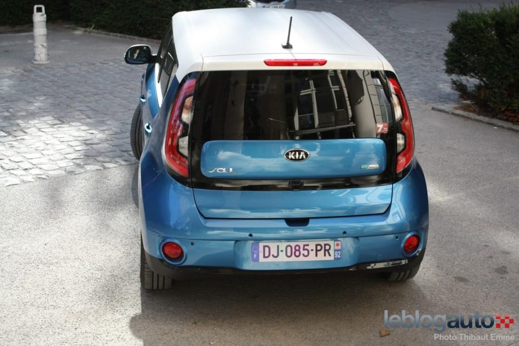 Sobriété que l’on retrouve sur le profil qui abandonne le bi-ton pour les élargisseurs d’ailes, les bas de caisse ou le bas du bouclier arrière. Mais le Soul EV conserve tout de même les grandes optiques avant, ainsi que la partie arrière « flottante » et son toit bi-colore. Le Soul EV est d’ailleurs disponible en trois couleurs dont deux spécifiques : white pearl avec toit bleu, bleu sky avec toit blanc ou black shadow avec toit rouge (couleur disponible en thermique).