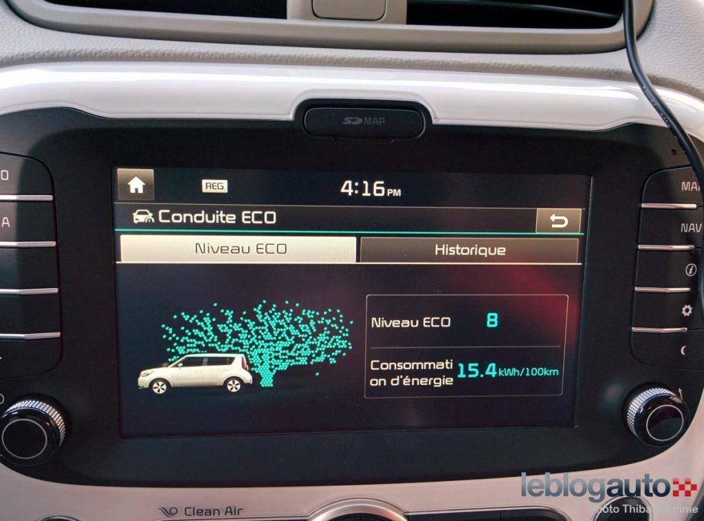 Pour le reste, le Kia Soul EV est un bon élève. Le sifflement habituel des modèles électriques est ici moins présent (moteur synchrone) et le tableau de bord est très lisible pour facilement voir si on a une conduite économe ou non. L’autonomie et divers outils de surveillance de sa conduite sont d’ailleurs accessibles sur l’écran tactile.