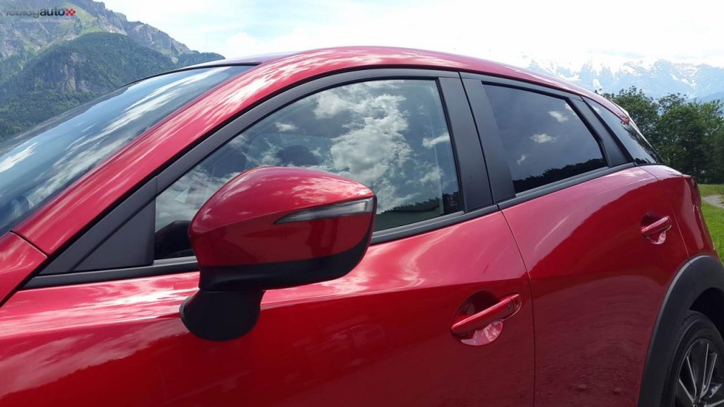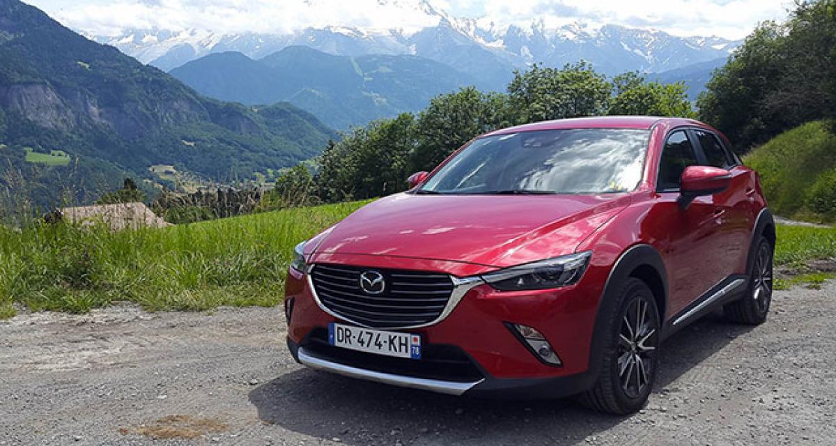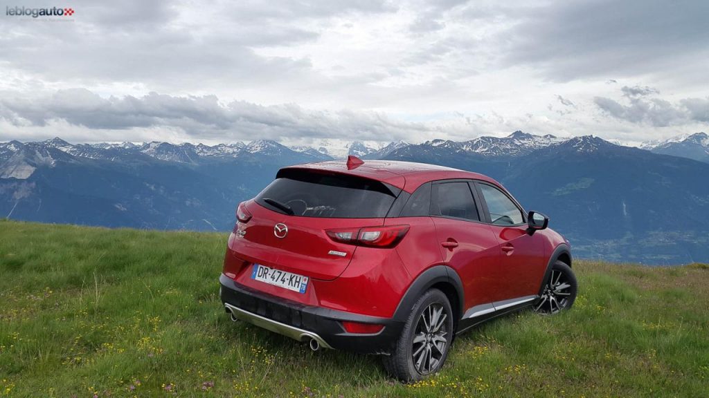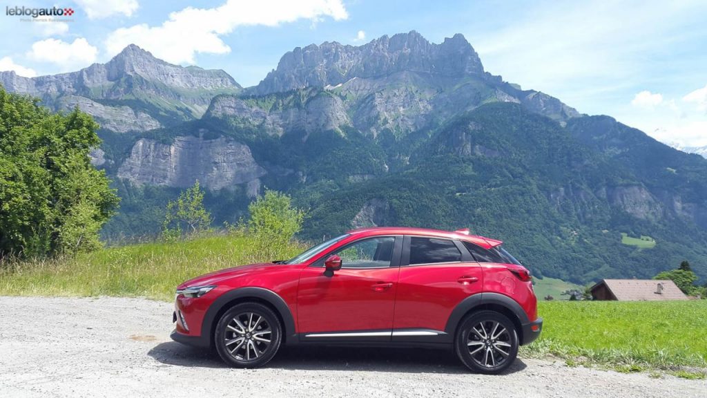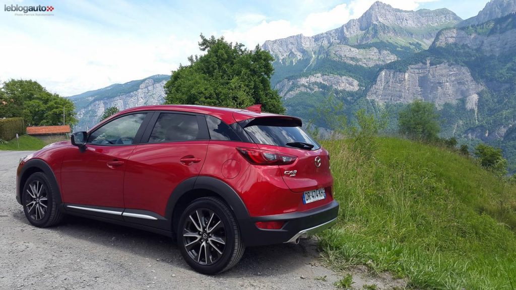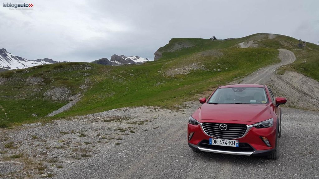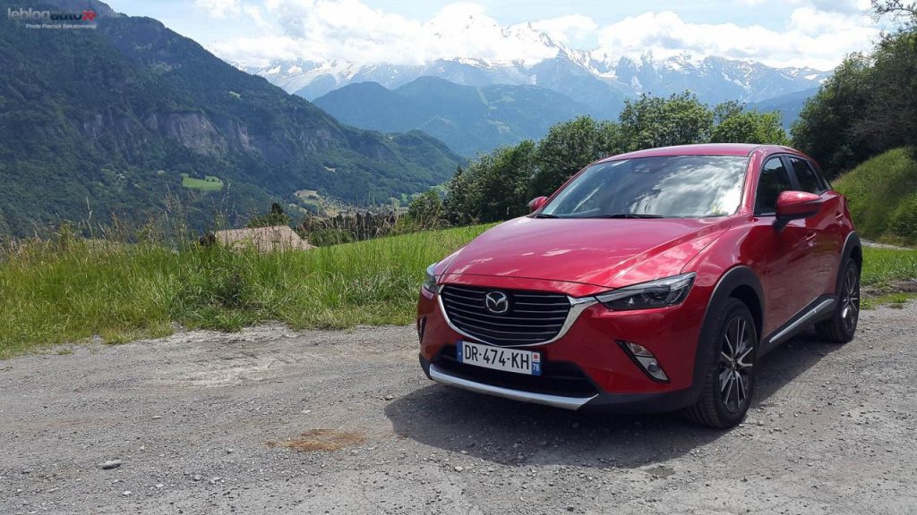 La position de conduite s’avère facile à trouver, mais la vision sur l’arrière se révèle particulièrement difficile compte tenu des custodes minuscules et de la vitre dans la même veine. En termes de confort, le CX-3 se montre au niveau des ténors du marché, voire supérieure si l’on excepte les Captur et 2008 qui font figure de référence. Le crossover japonais taquine le haut du panier sans complexe en ce qui concerne l’agrément de conduite sur route. En premier lieu grâce à son bloc diesel 4 cylindres de 105 chevaux, coupleux à souhait et qui offre des reprises énergiques dès les bas régimes… sans s’essouffler trop vite, même si on aimerait plus d’allonge. Son châssis partagé avec celui de la petite Mazda2 se montre réactif et rigoureux, mieux même que certaines berlines compactes. La direction manque un peu de consistance, mais ne gâche en tout cas pas le plaisir au volant. Le maintien des sièges avant et le roulis contenu permettent ainsi de ne pas trop subir les mouvements de caisse quand il s’agit de monter ou descendre un col de Haute-Savoie, comme nous avons pu le faire durant notre essai.