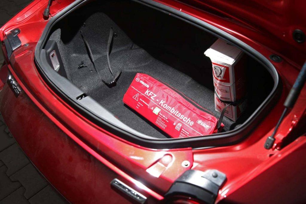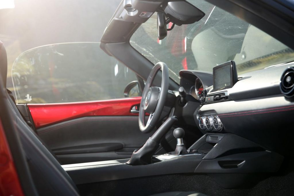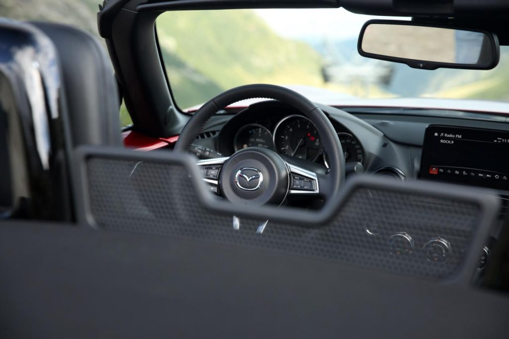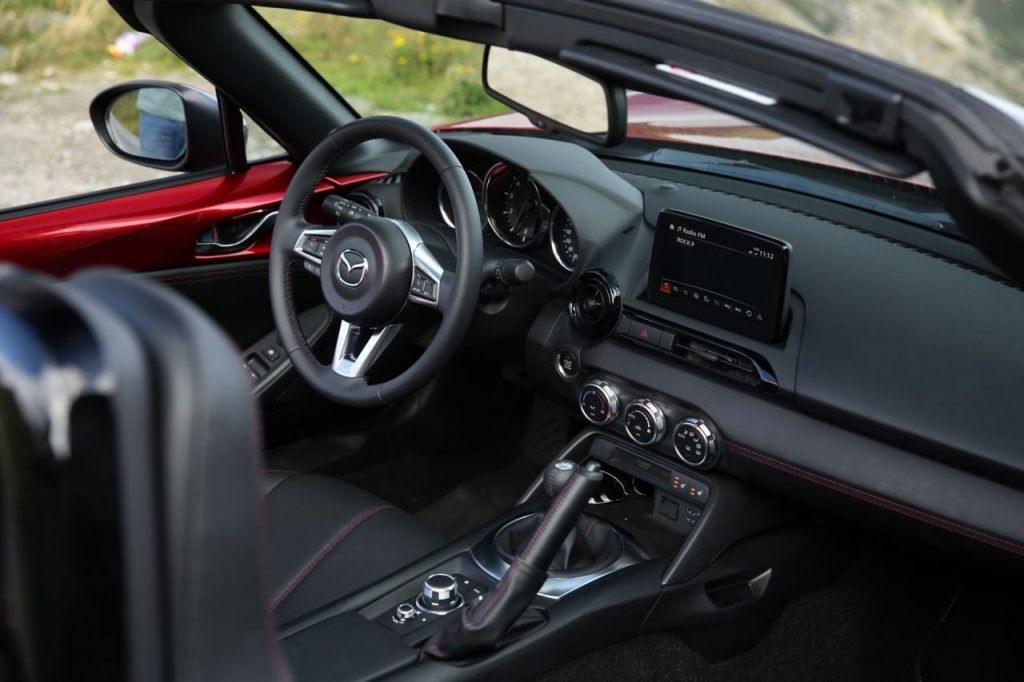 Avec cette mise à jour, le MX-5 gagne de nouveaux équipements. On note ainsi l’apparition du volant réglable en profondeur pour ajuster au mieux la position de conduite, la lecture automatique des panneaux, le freinage automatique d’urgence ou la caméra de recul. Pour le reste, l’univers intérieur ne change pas avec un espace confiné invitant à la balade à deux et des espaces de rangement toujours trop rares.