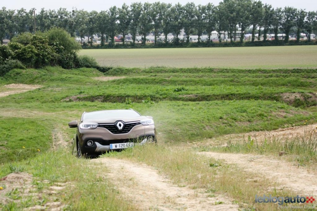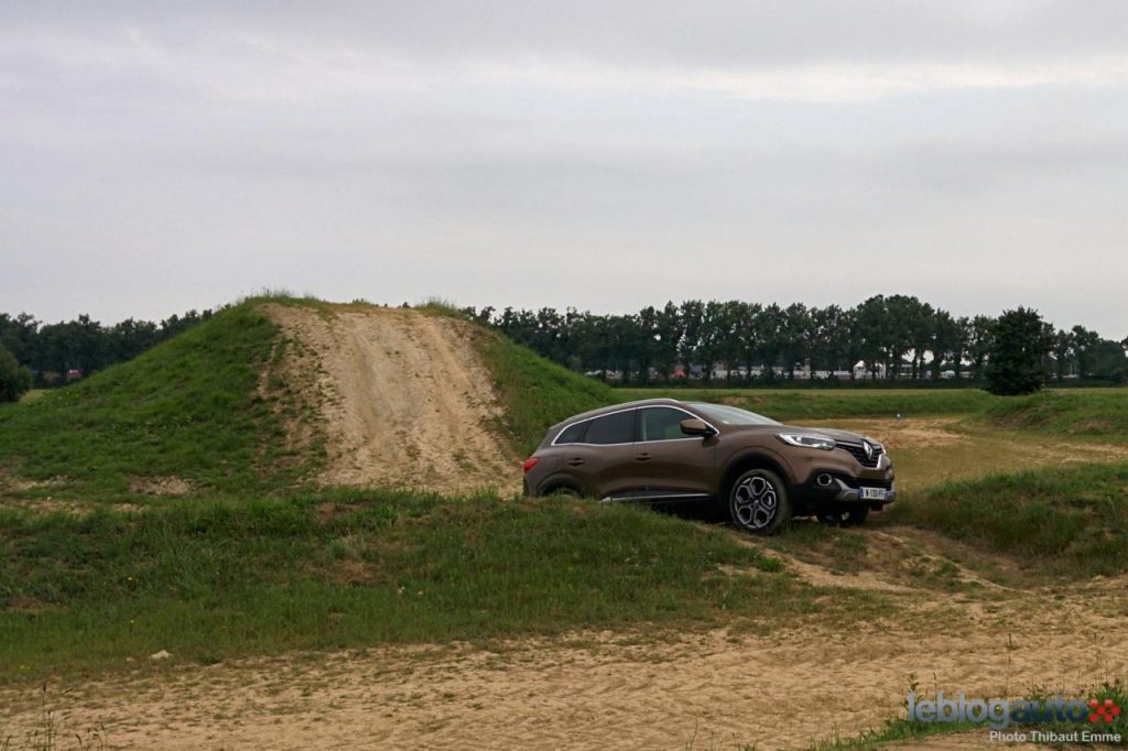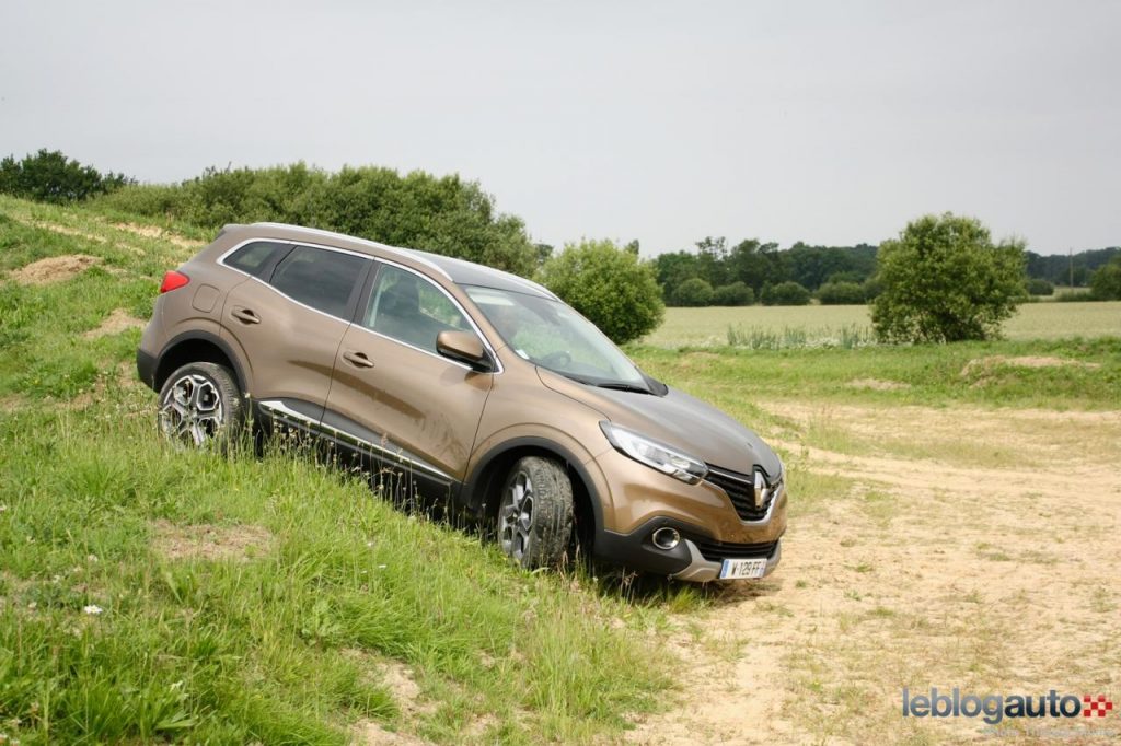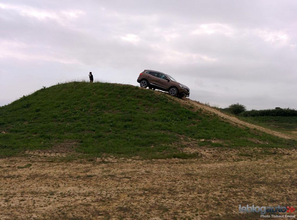 Une montée à plus de 40° s’avale sans trop de souci et le dCi 130 se montre suffisant. Un poil plus de couple ou une 1ère un peu plus courte serait appréciable mais même un débutant s’en sort sans souci. La descente qui suit montre de son côté les faiblesses des pneus route mais qui leur en voudra ? Les passages en dévers ne posent pas non plus de problèmes et on est même tenté de pousser le Kadjar un peu plus loin.