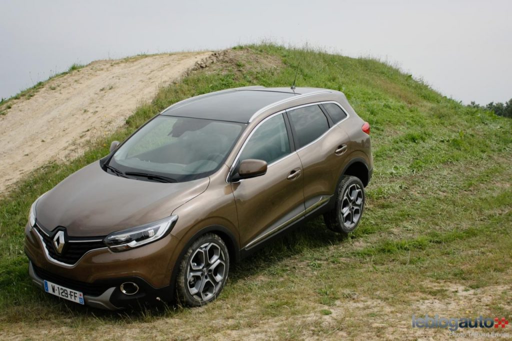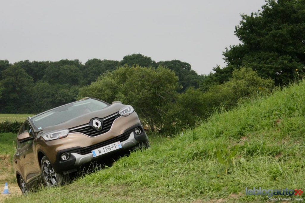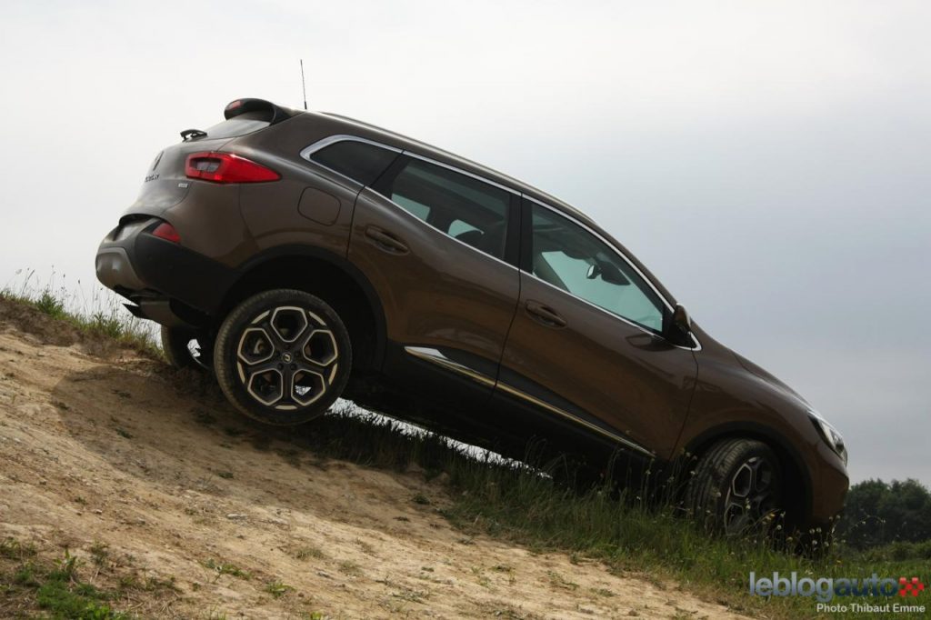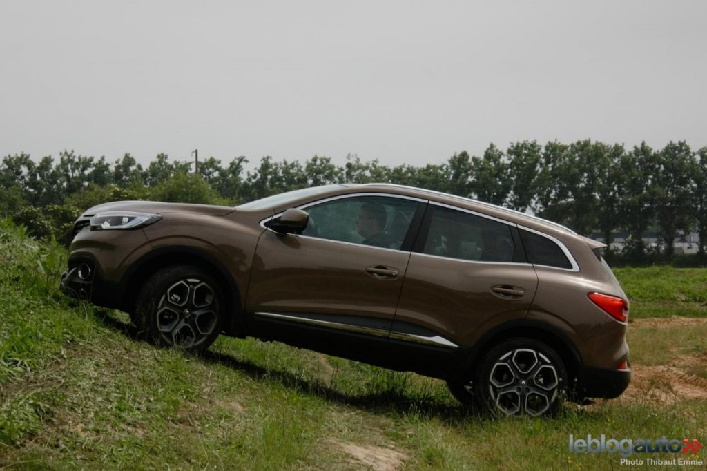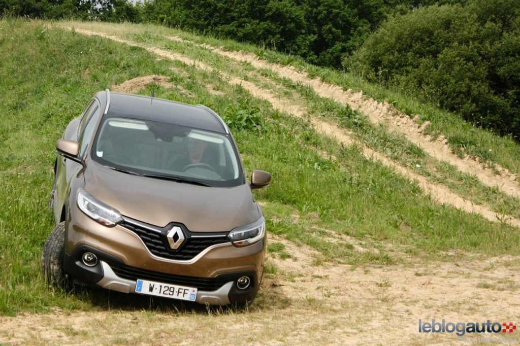 Une montée à plus de 40° s’avale sans trop de souci et le dCi 130 se montre suffisant. Un poil plus de couple ou une 1ère un peu plus courte serait appréciable mais même un débutant s’en sort sans souci. La descente qui suit montre de son côté les faiblesses des pneus route mais qui leur en voudra ? Les passages en dévers ne posent pas non plus de problèmes et on est même tenté de pousser le Kadjar un peu plus loin.