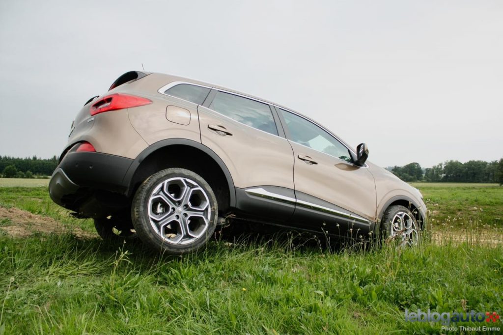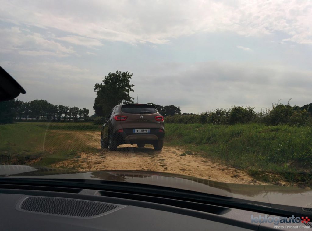 Même s’il a des atouts, le Kadjar ne part pas super bien armé pour la crapahute. En effet, son long porte-à-faux avant lui ferme l’angle d’attaque à 18°, mais l’angle de fuite lui reste d’une bonne valeur avec 28°. En plus, le Kadjar n’est pas livré avec une monte spécial 4×4 et cela se ressent. Toutefois on parvient à se sortir sans encombre de situations scabreuses une fois que l’on a compris les limites du véhicule et son fonctionnement (il a un léger temps de réaction à l’accélérateur).