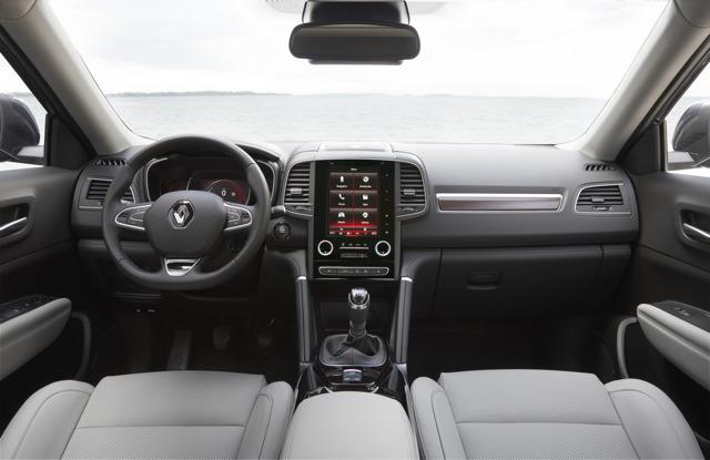 A l’intérieur, tout d’abord on s’attend à voir 7 assises. En fait il n’en est rien, et le choix s’avère assumé par le constructeur au Losange. Dans le même temps, ils reconnaissent pourtant que la concurrence visée se nomme Skoda Kodiaq, ou Peugeot 5008 entre autres, qui comptent deux sièges de plus. On se retrouve en territoire connu, dans un environnement quasi identique à celui d’une Mégane. La planche de bord logiquement plus verticale, va avec la position plus haute dans l’habitable. On se sent bien à toutes les places, à l’avant comme à l’arrière, avec toutefois un confort moins bon au milieu de la banquette. En termes d’équipements, il manque étrangement un régulateur de vitesse adaptatif, ce qu’on attend à ce niveau de gamme. La tablette R-Link ne change pas dans le Koleos, avec ses qualités, et aussi ses griefs. Le couplage du smartphone via Carplay ou Android Auto commence clairement à être la norme, et cela nous manque, surtout quand on saute d’une voiture à l’autre comme nous.