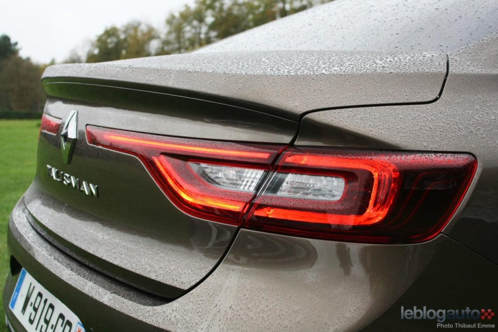 L’arrière aussi est une signature lumineuse à part avec ce bandeau de LED rouge (qui reste allumé de jour) qui rejoint le logo centré sur la malle arrière. On peut y voir un clin d’oeil à la Safrane mais c’est surtout le rappel de la signature de la voiture de piste Renault R.S. 01. Les feux sont en relief avec une surface de pleins et de creux. La malle est surlignée par un béquet intégré alors que le bas du bouclier intègre deux sorties d’échappement chromées dont une seule est fonctionnelle.