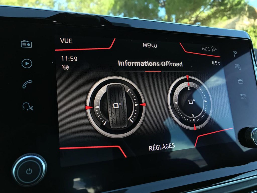 En dessous les commandes de climatisation, puis autour du sélecteur de la boite automatique, les commandes relatives à la conduite. Derrière le volant, on retrouve un autre écran couleurs, paramétrable suivant les envies. Au rang 1 et 2, rien à dire en termes d’espace disponible. Évidemment les occupants des 6ème et 7ème sièges ne seront pas forcément du même avis, mais on a vu bien pire en la matière. Côté charge, 760 l en 5 places et 1 920 en rabattant toutes les assises arrière.