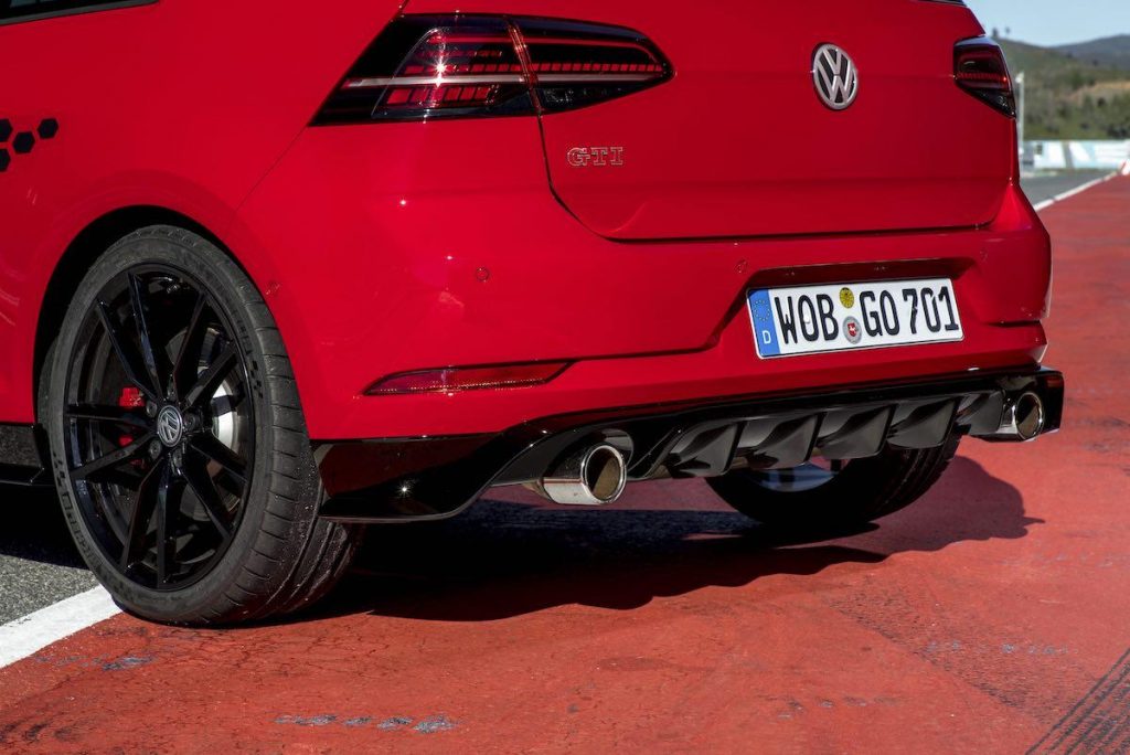 Nous voilà donc avec la GTI TCR en guise de lot de consolation. Avec un nom aussi évocateur (il fait référence à la Golf GTI de course évoluant dans la catégorie TCR) et une présentation extérieure radicalisée au maximum, vous penseriez qu’il s’agit d’une déclinaison encore plus extrême que la GTI Clubsport S interdite à notre marché. Précisons au passage que les stickers latéraux particulièrement voyants peuvent heureusement se décoller en concession. Mais le reste du kit carrosserie n’a rien à envier aux sportives les plus agressives de la catégorie.