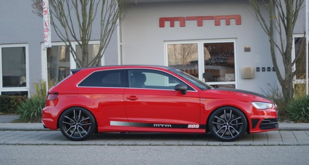 Performances de la S3 MTM ? 250 km/h en vitesse de pointe, 4,9 s pour passer de 0 à 100 km/h ou 12,6 s pour atteindre 200 km/h quand la S3 de série affiche par exemple la même vitesse maximale ou 5,1 s et 5,4 s dans l’exercice du 0 à 100 km/h respectivement avec la boîte S Tronic ou boîte manuelle. MTM boucle avec des jantes BBS (nouveau modèle XA), enveloppes Pilot Super Sport de 235/35 et menu traitement de carrosserie.