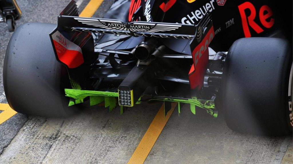Dans la galerie ci-après, photo 2, on voit le diffuseur de la RB14 avec de la peinture aéro. « Aero paint » ou « Flow Viz », cette peinture fluo accroche aux éléments et permet de visualiser concrètement les mouvements aérodynamiques. Le tout est encore et toujours de vérifier que la soufflerie et le CAO sont bien calibrés. Ainsi, avant même de prendre la piste, on peut savoir si tel ou tel élément fera bien son office.