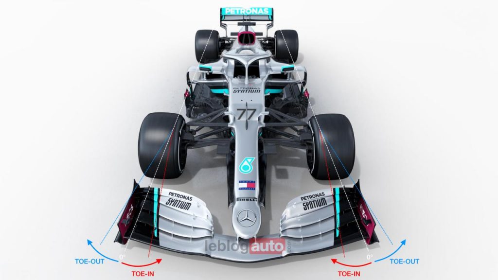 En F1, on met généralement toe-out à l’avant (ainsi le pneu intérieur est déjà tourné vers l’apex), et du toe-in à l’arrière.