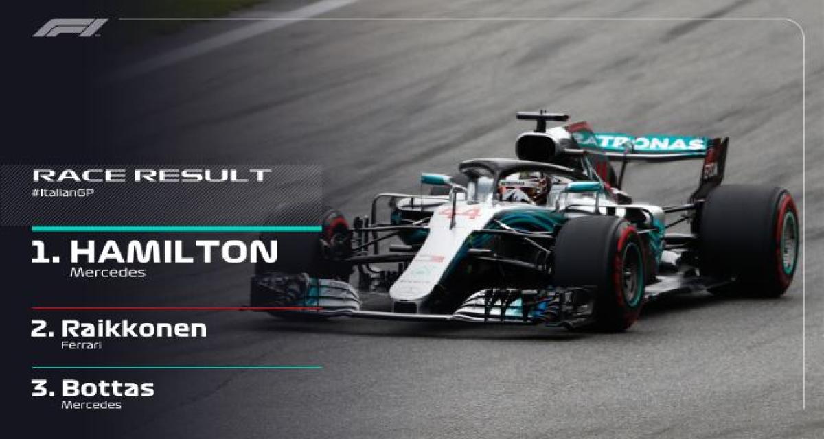 Verstappen est pénalisé de 5 secondes pour son gros tassage sur Bottas. Ce dernier termine le GP dans l’aileron de la Red Bull. Il prend la 3e place et Vettel dépasse même sur tapis vert le pilote batave. Hamilton remporte le GP d’Italie et profite de la relative contre-performance de Vettel pour grappiller encore plus de points. Pour Räikkönen, cela sentait bon la victoire mais Hamilton a su porter l’attaque au bon moment et créer un petit écart par la suite. C’est tout de même un 100e podium pour Kimi et un 30e depuis sa dernière victoire (mars 2013 avec une victoire au GP d’Australie en Lotus-Renault).