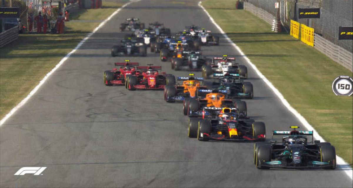 Très mauvais départ d’Hamilton qui se fait passer de toute part, notamment par Ricciardo en tendres. Juste derrière, c’est en paquet. Gasly touche légèrement Ricciardo et l’aileron du Français casse. Il passe sous les roues avant et file tout droit dans les graviers et les pneus. Tsunoda touche Kubica qui part en tête à queue. Voiture de sécurité. Bottas, Verstappen, Ricciardo, Norris, Hamilton, Leclerc, Sainz, Giovinazzi, Stroll et Perez.