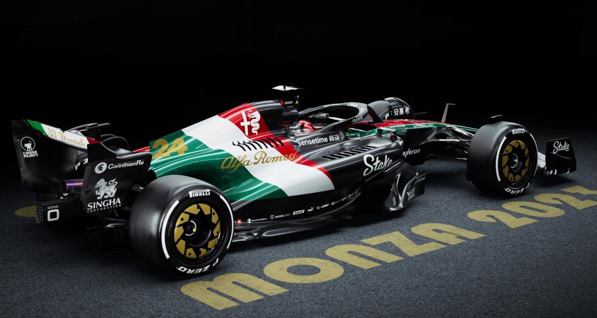 Cette livrée se remarque aussi au motif des jantes qui est passé au jaune / or, rendant hommage ainsi à la fameuse Alfa Romeo 33 Stradale et au design « vintage » des jantes Alfa Romeo perforées, avant que le design à fer à cheval ne prenne la relève. C’est aussi donc le moyen d’évoquer indirectement la Nuova 33 Stradale, réinterprétation moderne de la sportive des sixties, que le Biscione vient tout juste de dévoiler en amont du grand prix d’Italie. La livrée a été dévoilée par les pilotes Alfa Romeo F1 Team Stake, Valtteri Bottas et Zhou Guanyu, lors d'un événement spécial au Musée Alfa Romeo d'Arese, près de Milan, pour marquer le lancement de la nouvelle 33 Stradale. Autre petit détail qui tue, le « 33 Stradale » doré qui apparaît sur le revers de l’aileron arrière, sur fond là aussi de drapeau italien.