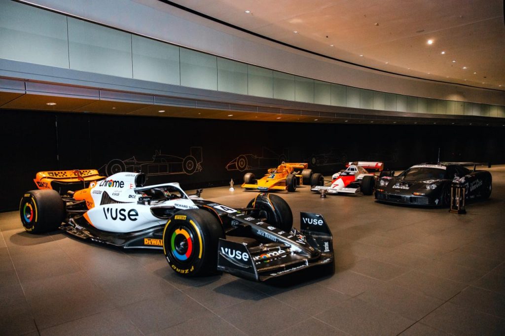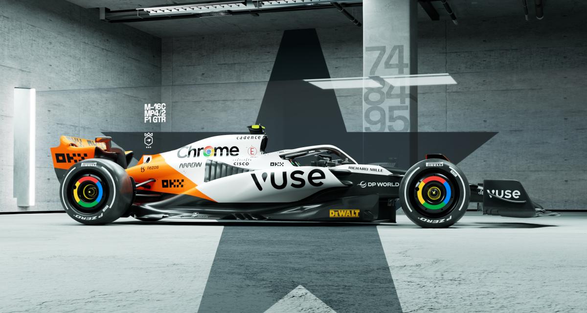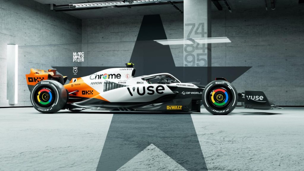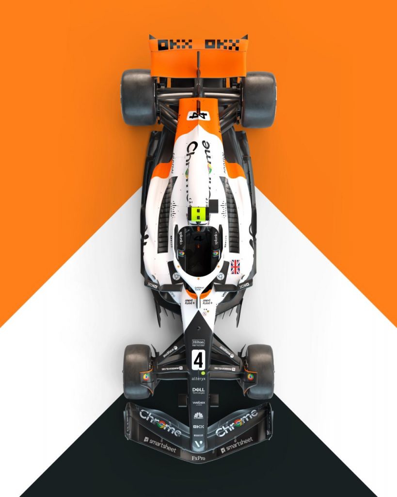 La livrée fusionne celles des voitures qui ont accompli ces exploits du passé : l'Indy 500 1974 avec Johnny Rutherford, le Grand Prix de Monaco 1984 avec Alain Prost et les 24 Heures du Mans 1995 avec JJ Lehto, Yannick Dalmas. et Masanori Sekiya. Des éléments de papaye de la première M16C / D gagnante de l'Indy 500 couvrent l'arrière de la MCL60 de Lando Norris et d'Oscar Piastri avant de passer en son centre au blanc glacé tiré de la MP4 / 2 gagnante du Grand Prix de Monaco 1984 d'Alain Prost. Le mélange de l’orange papaye et du blanc rappellera de loin le rouge et blanc que tout le monde connaît, qui a accompagné les livrées des McLaren en F1 de 1976 à 1996, mais, qui pour des raisons légales sur la publicité du tabac, ne peuvent plus être utilisées. L'avant de la voiture est fini en noir en hommage à la F1 GTR qui a remporté les 24 Heures du Mans lors de la première tentative de McLaren en 1995.