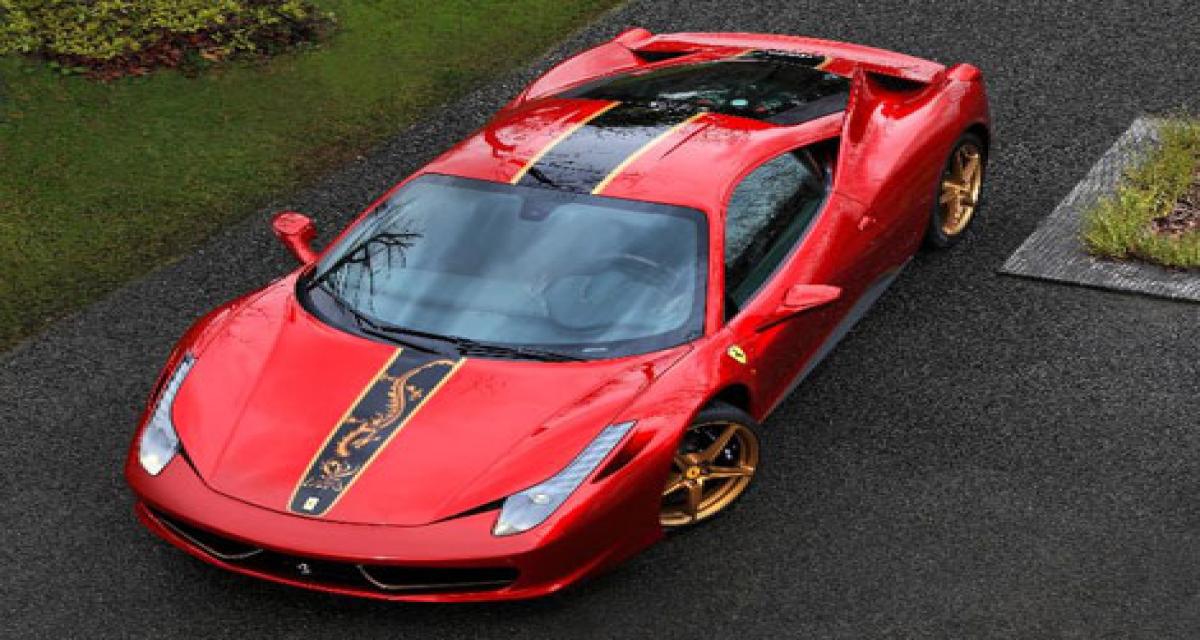 Pour cette édition, Ferrari offre à sa berlinette un rouge inédit, baptisé Marco Polo. Un rouge métallisé associé au doré pour les jantes ou des détails de finition intérieure. Tandis qu’une bande noire relevée d’un dragon court au centre du véhicule, du logo avant à l’inscription arrière. Un thème esthétique officiellement inspiré par le mot chinois « longma » (龙马), soit dragon-cheval. Un bon moyen d’associer le puissant dragon au cheval de la marque…