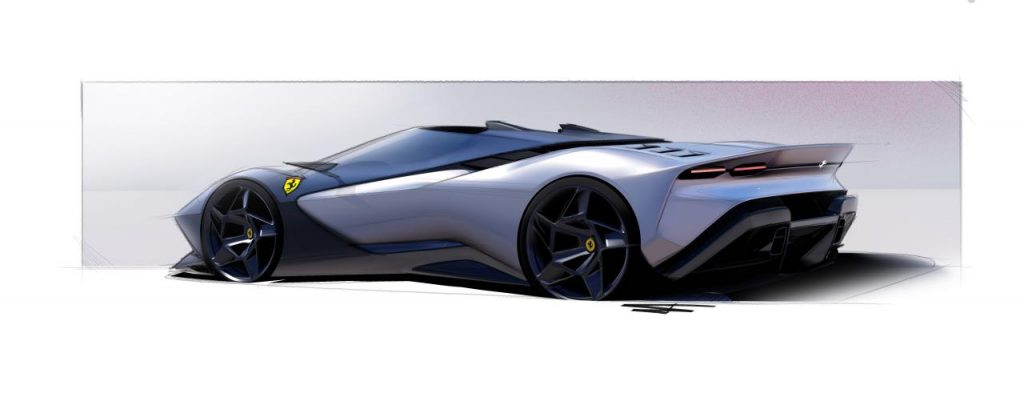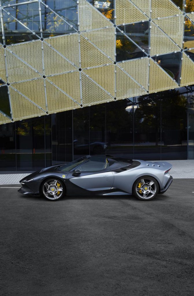 Le thème stylistique principal de la voiture s'articule autour de la façon dont ses volumes se croisent et se fondent les uns dans les autres : l'avant en fibre de carbone non peint s'enroule jusqu'à l'arrière, créant un effet bicolore qui crée un contraste puissant en termes de couleurs et de matériaux. . L'élimination du toit rigide escamotable a permis aux concepteurs de relooker radicalement toute la partie arrière, en lui donnant un volume complet avec une ligne de ceinture tendue. Le volume de la voiture est divisé en deux parties reliées par une zone centrale fonctionnelle en noir mat qui comprend les prises d'air latérales avec des conduits séparés pour les refroidisseurs intermédiaires et le moteur. La partie supérieure de cette bande intègre un évent pour le compartiment moteur avec des éléments longitudinaux qui font référence aux virures latérales typiques des Ferrari du passé.