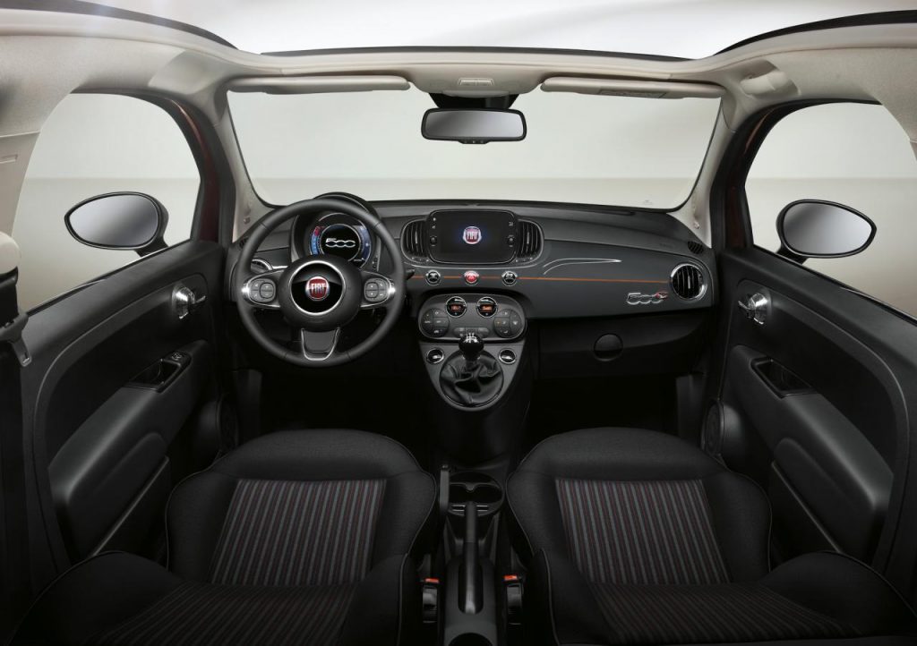 Pour cette édition automnale, l’habitacle de la 500 Collezione troque ses couleurs vives pour une ambiance sombre. Les sièges reçoivent une sellerie à rayures noires et bordeaux avec partie supérieure en vinyle noir et logo 500 brodé de couleur bordeaux. La planche de bord a droit un liseré cuivré sur toute sa longueur.