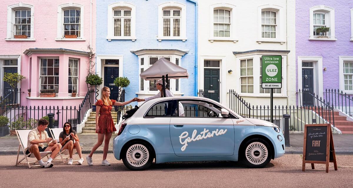 Au Royaume-Uni, l’heure n’est plus aux glaciers ambulants propulsés par de vieux moteurs diesel polluants. En réponse à des réglementations de plus en plus strictes concernant les émissions dans les villes, Fiat a développé la Fiat 500 Elettrica Gelateria , affirmant qu'elle est « le glacier le plus petit et zéro émission au monde ».