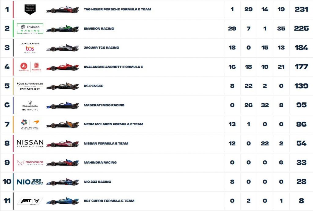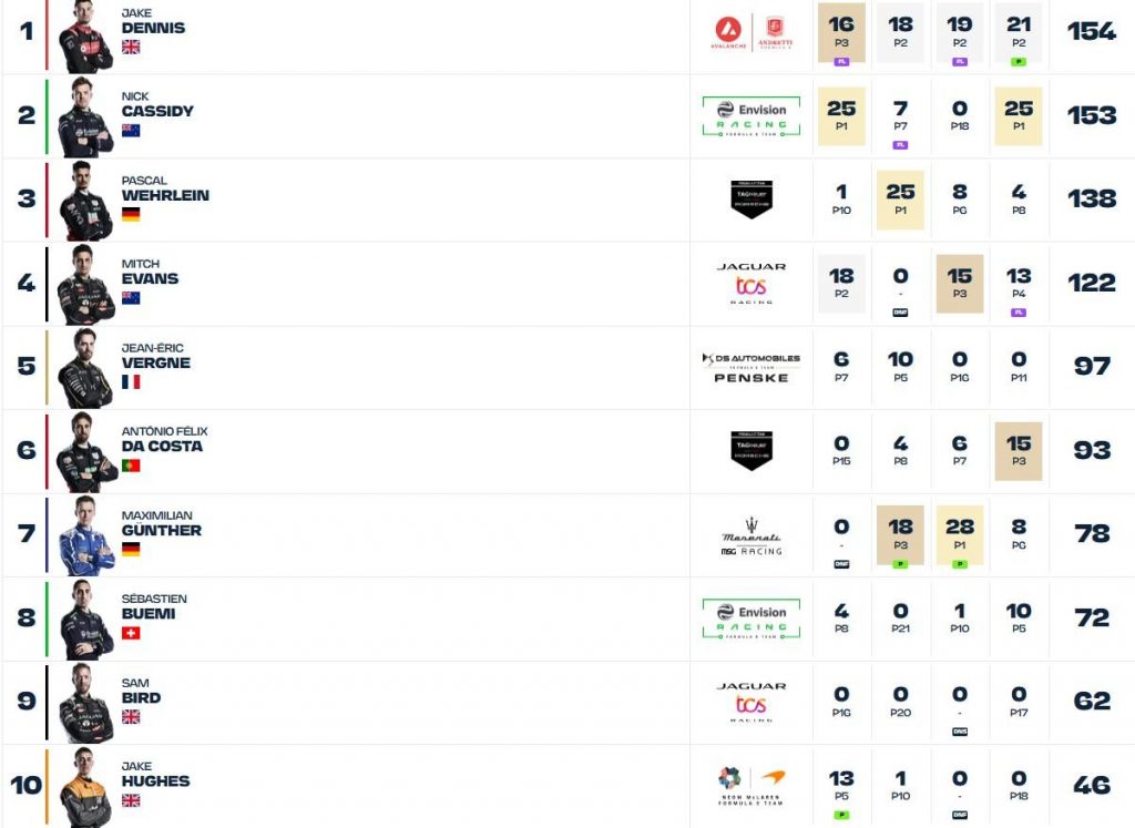 A ce jeu du chat et de la souris, Nick Cassidy a été le plus malin et a su conserver la tête après la dernière relance de Safety-Car. Il remporte sa 3e course de la saison et devance Jake Dennis (Andretti) qui effectue la bonne opération en prenant la tête du championnat pour…1 point devant Cassidy, la troisième marche du podium revenant à Antonio Félix da Costa (Porsche). Mauvaise pioche encore pour Pascal Wehrlein (Porsche), seulement 9e et qui retombe à la 3e place du championnat pilotes. Mauvaise affaire aussi pour DS Penske, puisque JEV et Stoffel Vandoorne terminent hors des points, après s’être élancés en fond de grille après une disqualification pour infraction technique lors des essais. Cela s’était déjà produit à Monaco…