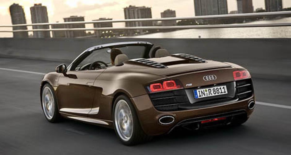 Des photos qui ne révèlent que ce Spider adopte le V10 5.2 FSI, puisqu’il reprend les détails stylistiques typiques de cette motorisation à l’avant comme à l’arrière, ainsi que les discrets logos « V10 » sur l’aile avant. La capote souple disparaît totalement sous un couvercle rigide. De profil, les habillages bicolores du coupé disparaissent, comme le révélaient les photos des prototypes.