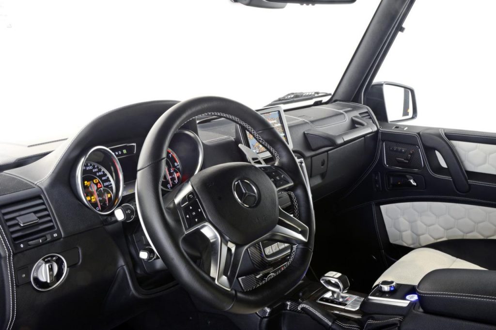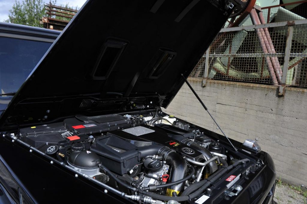 Le Classe-G a toujours été l’un des sujets favoris de Brabus, malgré son âge avancé, mais grâce à son succès auprès des clients… Le V8 du G63 adopte donc le dernier niveau de préparation de Brabus, et affiche donc 850 ch comme pour les Classe-S ou CLS… Une préparation qui a nécessité l’accroissement de la cylindrée de 5,5 à 6,0 litres, et l’échanges des turbos pour des unités plus volumineuses… Le couple dantesque est de 1450 Nm.