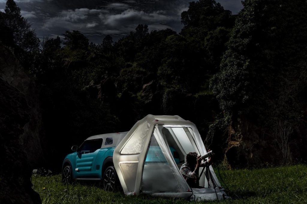 Malgré son absence de toit, le Cactus M peut protéger ses occupants de la pluie et même plus. En effet, un toit gonflable (logé dans le coffre) se déplie à l’envie et peut même se transformer en tente improvisée pour 2 personnes. Les sièges se transforment quant à eux en couchette et on peut donc aller profiter du coucher de soleil (ou du lever, ou les deux) avec cette Cactus M. L’attention du détail va même jusqu’aux ouvertures de portières par des lanières de tissus que l’on tire.