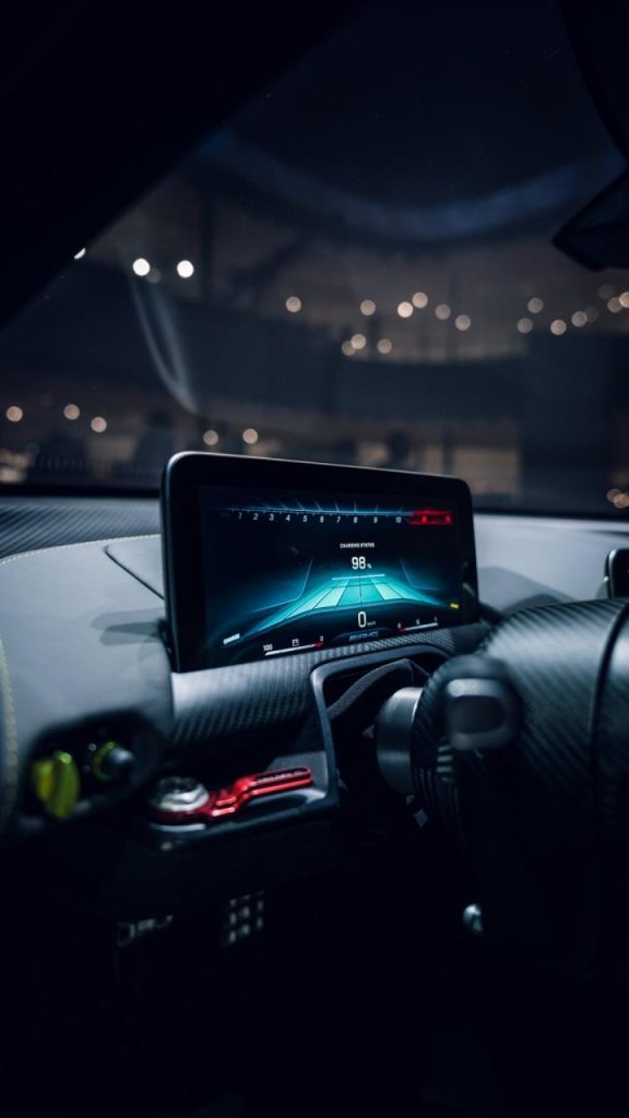 Si ces deux moteurs disposent de leur batterie spécifique, les moteurs situés dans les roues avant dispose d’une batterie lithium-ion plus commune qui permet même d’évoluer en pur électrique sur environ 25 km. 80% de l’énergie d’un freinage peut être récupérée par la Mercedes-AMG Project ONE. Avec deux moteurs dans les roues avant, Mercedes contrôle précisément le couple envoyé dans chacune et réalise ainsi la répartition optimale du couple.