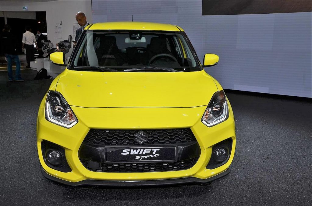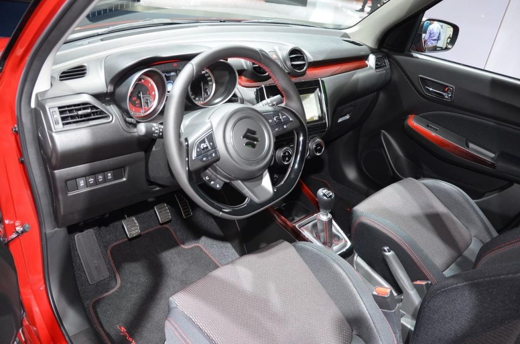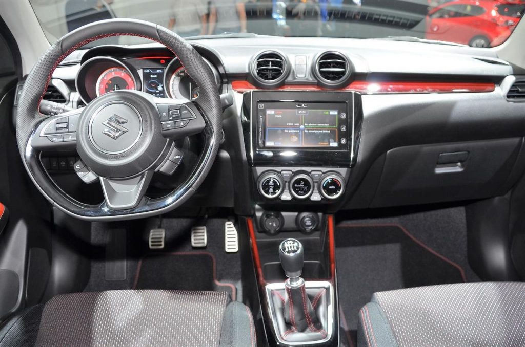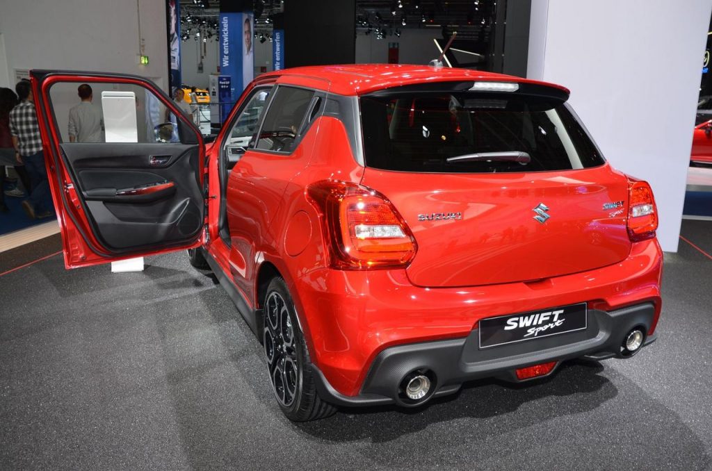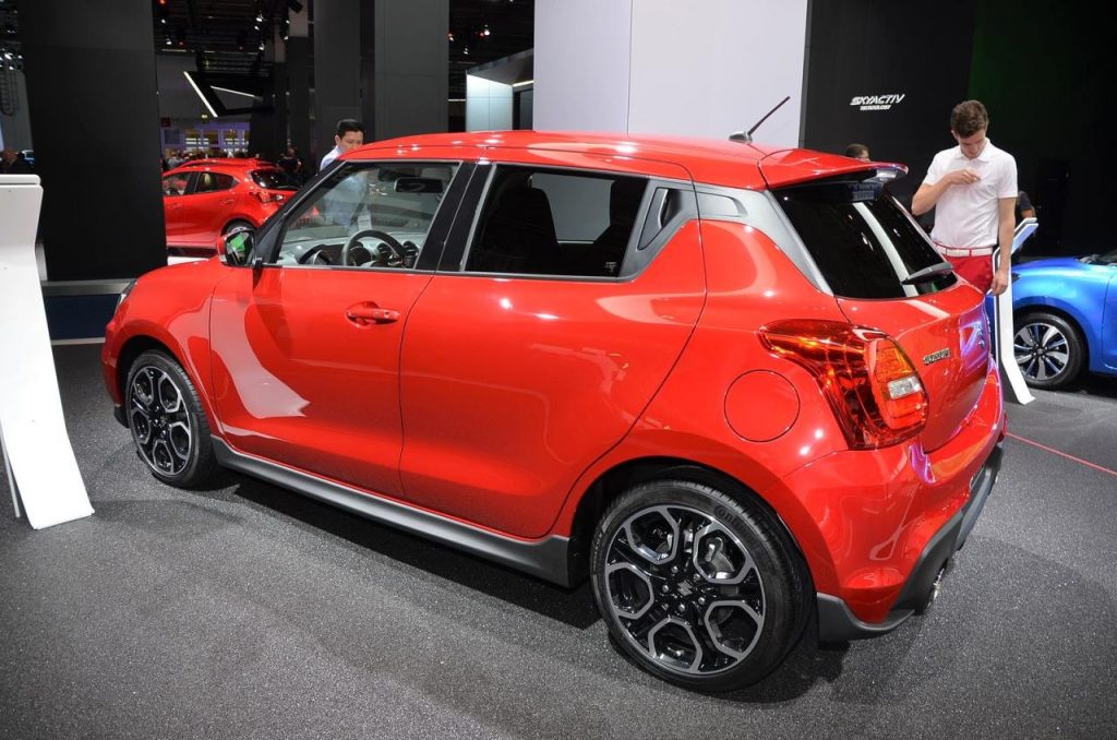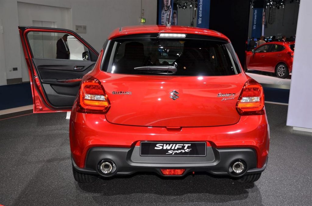 La petite sportive nous est déjà familière grâce aux premiers clichés révélés fin juillet. Elle se différencie de ses sœurs par un bouclier avant équipé d’une calandre plus massive, un spoiler et des bas de caisses spécifiques ainsi que des jantes à cinq bâtons aux galbes tout en rondeurs et des jantes de 17 pouces. À l’arrière la Swift Sport se dote d’un petit diffuseur entouré de deux sorties d’échappement.