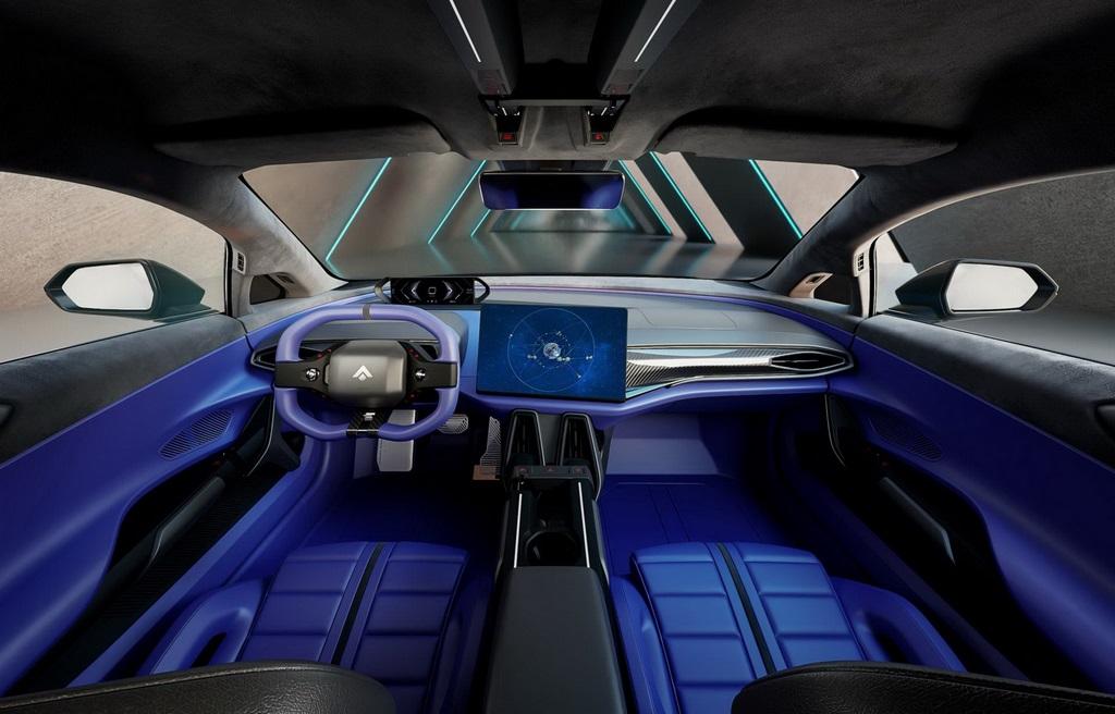 Au niveau des lignes, rien de bien transcendant. C’est futuriste mais on a l’impression d’avoir déjà vu ce dessin des centaines de fois. L’avant manque de subtilité avec ces grands feux transversaux et un spoiler assez rudimentaire. L’arrière par contre est plus réussi, avec un jeu visuel bien pensé entre les optiques, le spoiler et le diffuseur. On sent les influences de Porsche et de McLaren dans le trait de la poupe. L’intérieur n’est visible que par des rendus 3D, ce qui souligne que le projet n’est pas encore totalement finalisé.