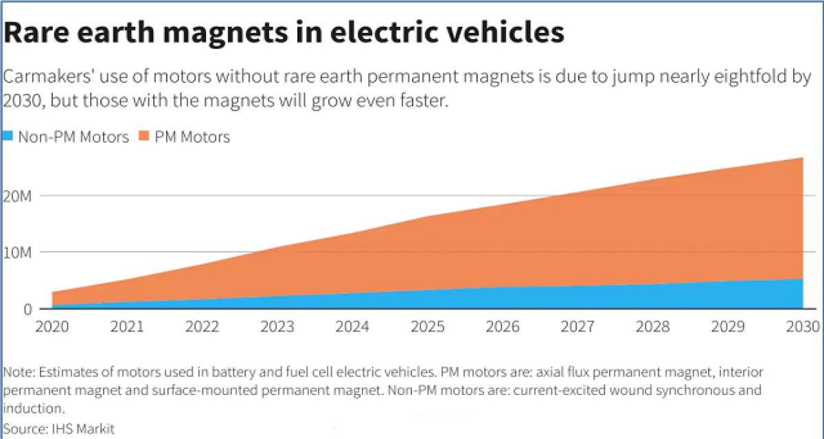 Les alliages métalliques et les aimants finis produits à partir de terres rares sont des pièces essentielles utilisées dans la fabrication de moteurs pour véhicules électriques.