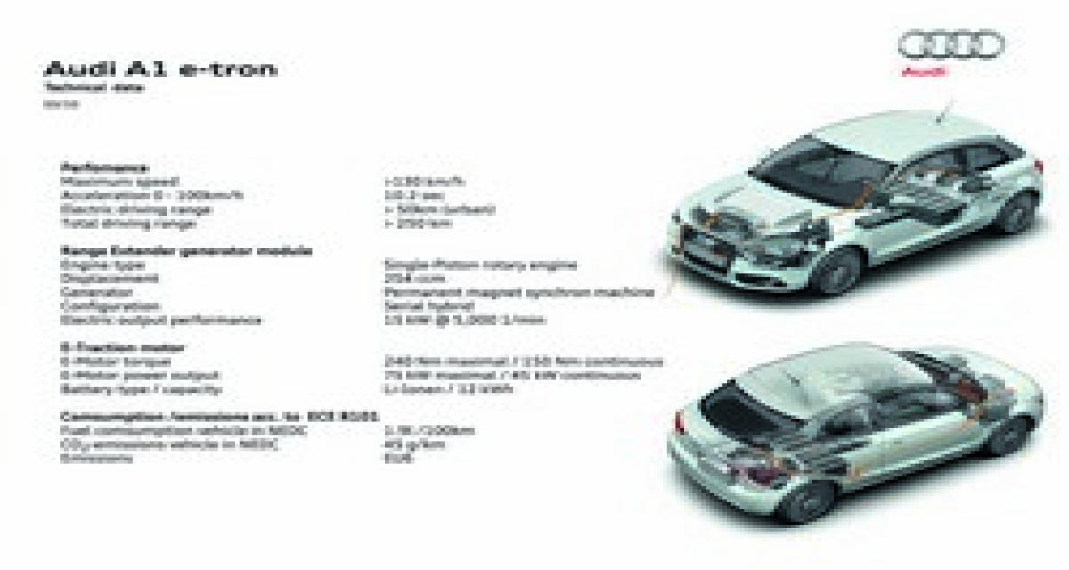 Les CP se bousculent en ces premières heures du salon de Genève. Audi livre les détails sur l’A1 e-tron Concept laquelle reprend son bloc de batteries en forme de T en position similaire à ce que l’on connaissait déjà sur la Chevrolet Volt. Le petit propulseur Wankel en pur générateur prend pour sa part place en lieu et place de la roue de secours. Ce moteur électrique offre en solo une autonomie de 50 km, libère une puissance de 45 kW (75 kW en pointe) pour un couple de 150 Nm (240 Nm en pointe) et est alimenté par un ensemble de batteries d’une puissance de 15 kW. Comptez sur une autonomie combinée de 200 km, 130 km/h en v-max et 10,2 s pour s’affranchir du 0 à 100 km/h. Le reste en images !