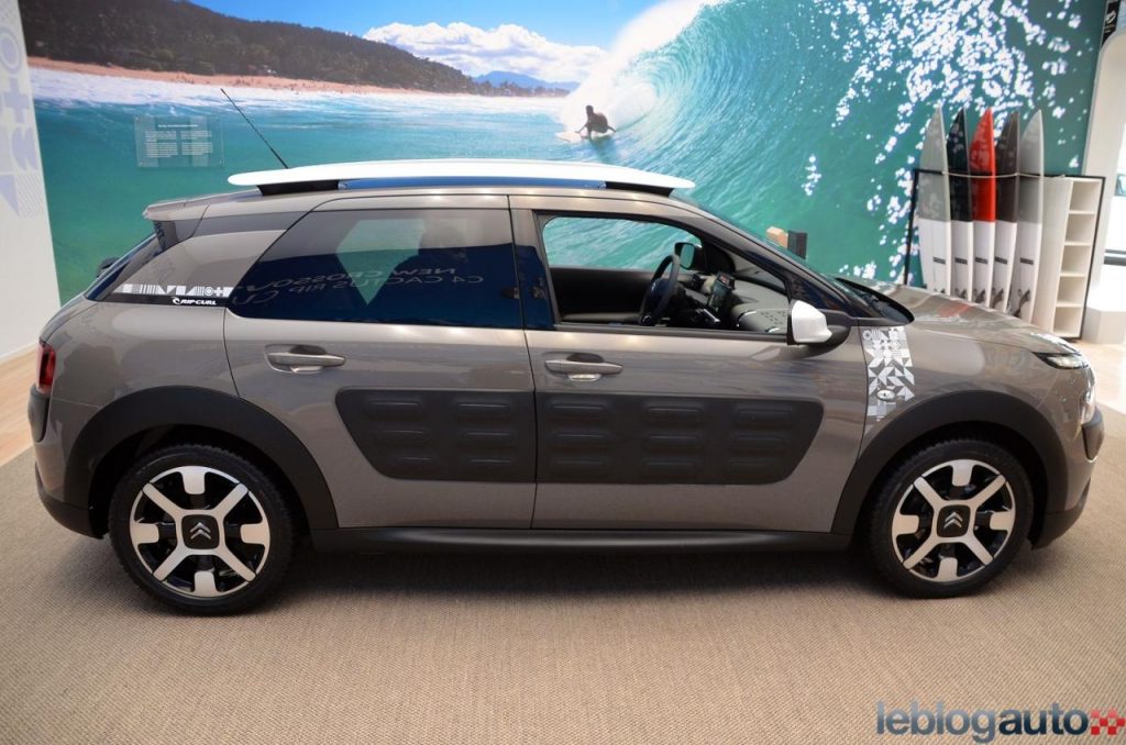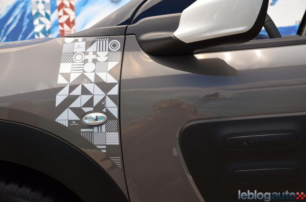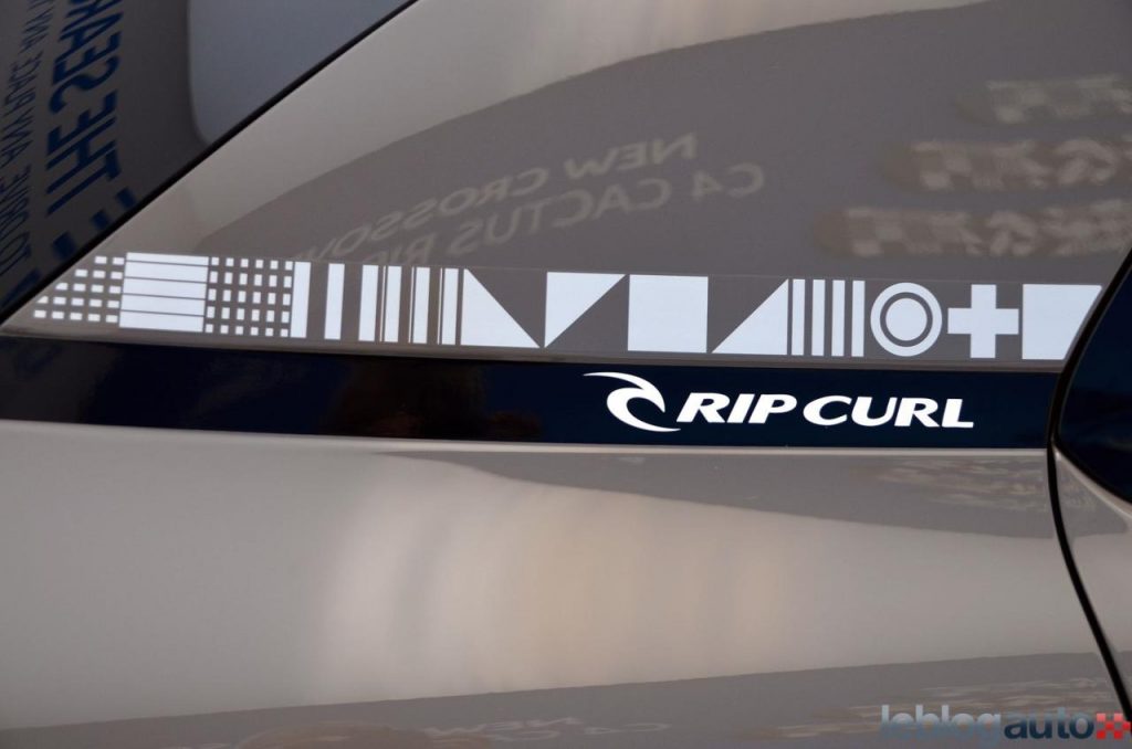 Ce Cactus est en finition Shine. Quelques inserts « pulp orange » – cerclages des hauts-parleurs, surpiqûres des tapis de sol ainsi que les ceintures de sécurite – viennent égayer l’intérieur un peu sobre déjà connu. L’extérieur est à peine plus gai avec une très chic mais sobre teinte grise rehaussée par les stickers Rip Curl sur les ailes avant et le montant arrière. Un faux sabot de protection à l’avant achève le look baroudeur.