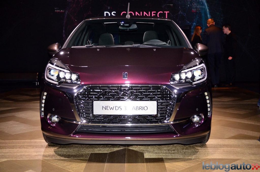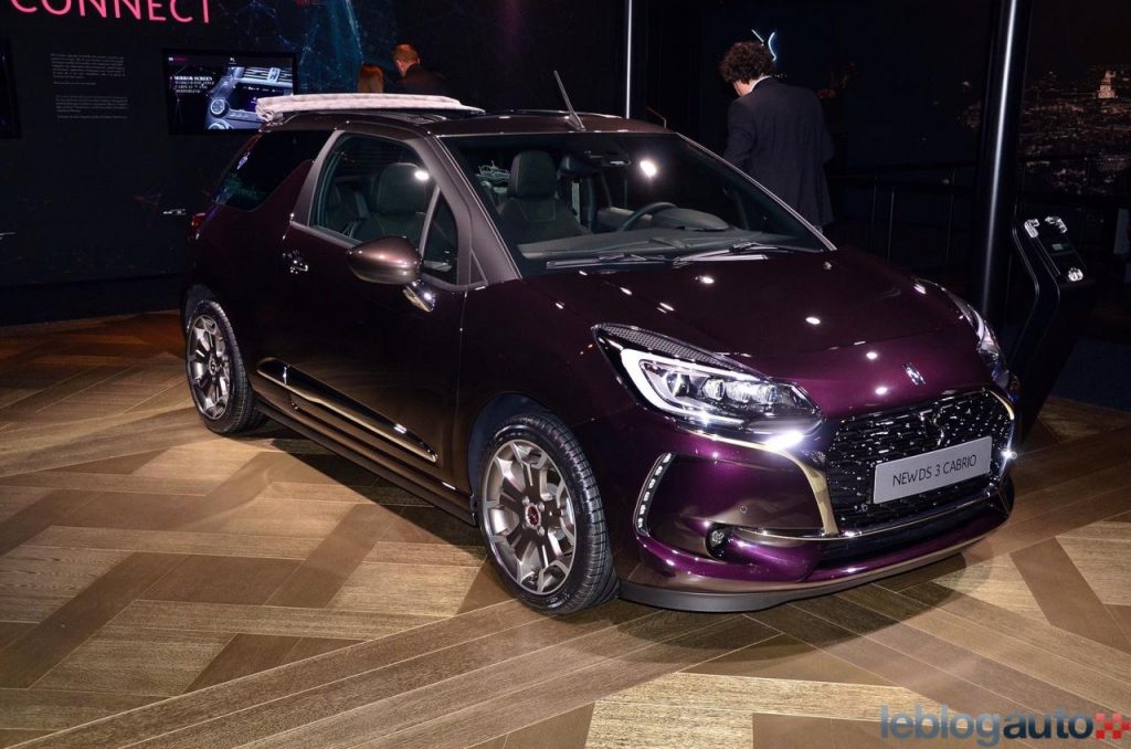 Une DS3 Cabrio restylée dans sa livrée de carrosserie ton violet, DS 3 restylée découverte reprenant les traits de sa cousine fermée.