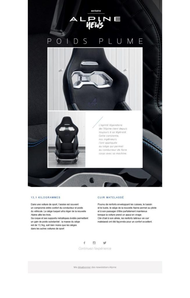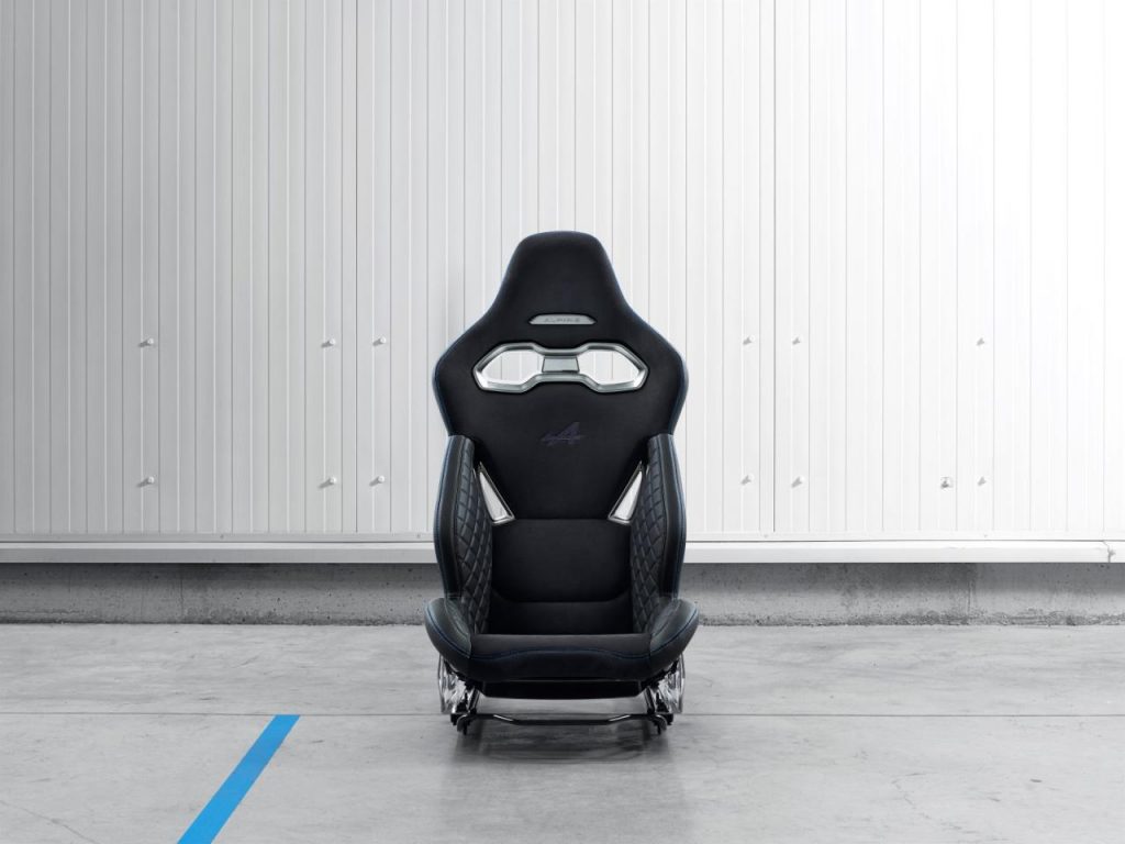 « Pourvu de renforts enveloppant les cuisses, le bassin et le buste, le siège de la nouvelle Alpine permet au pilote et à son passager d’être parfaitement maintenus lorsque la voiture prend un appui en virage. Clin d’œil à son aînée, les renforts latéraux en cuir matelassé ont été façonnés pour un confort excellent ».