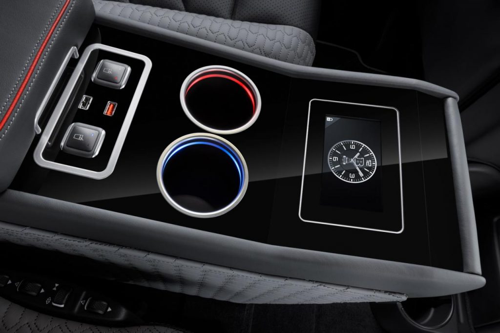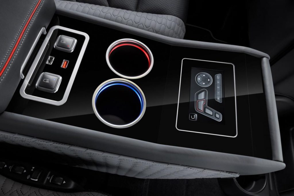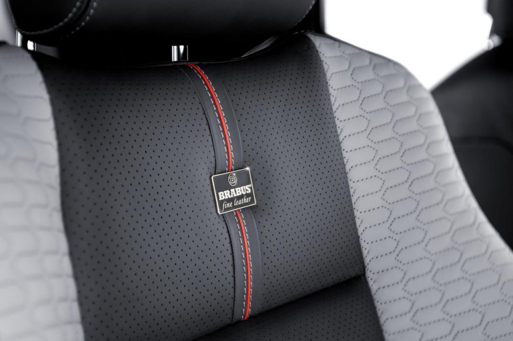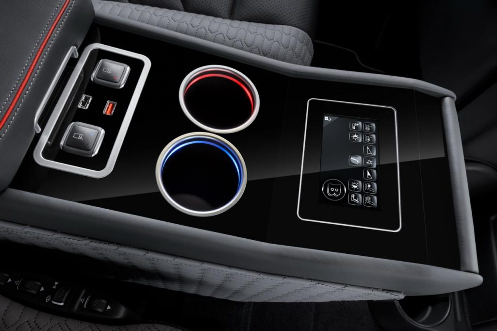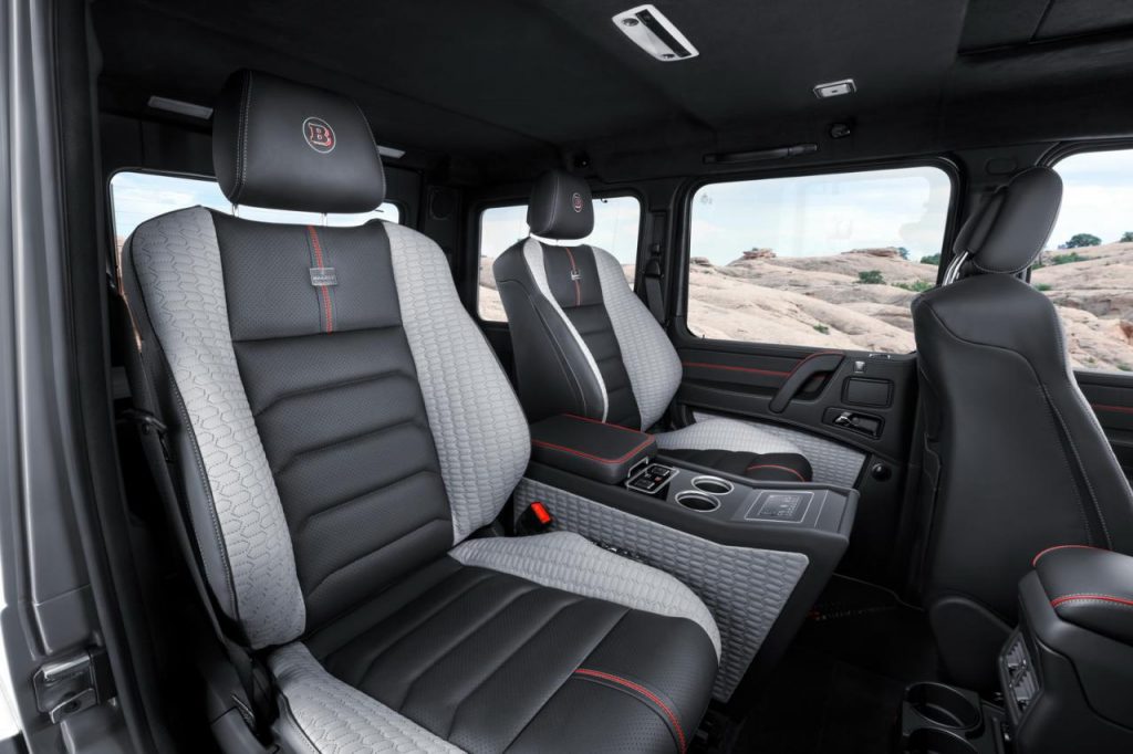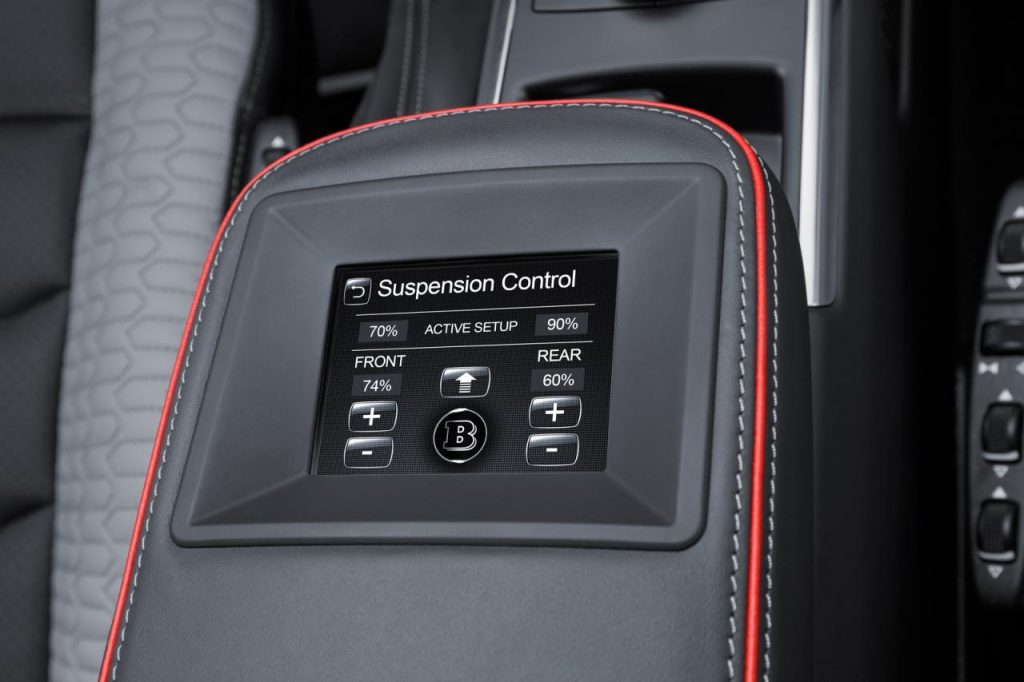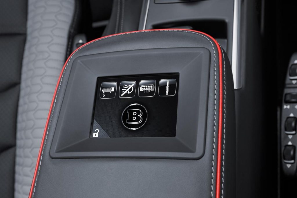 Les phares additionnels à l’arrière pivotent et sont pilotés depuis l’habitacle. Tout comme la suspension réglable. Pour cela, Brabus a prévu un écran tactile intégré à l’accoudoir central. Un autre écran est intégré à l’accoudoir arrière et permet aux passagers des deux places de commander le réglage des sièges ou le système multimédia.