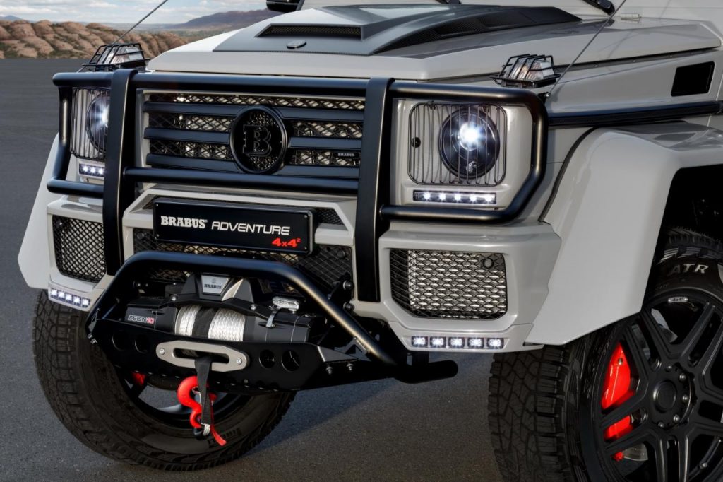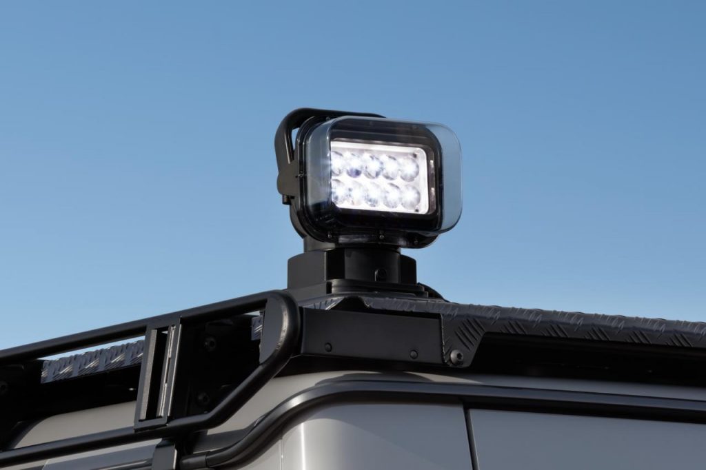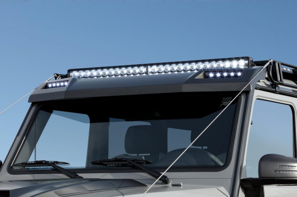 Si d’aventure vous trouvez le Classe-G 4×4² trop timide, Brabus a la solution. Ou plusieurs solutions, puisque le préparateur nous avait déjà proposé sa propre version toute de noir vêtue. Point de noir ici pour cet aventurier, qui se dote des équipements adéquats : treuil, protection de la grille avant, tôles de protection du pavillon et câbles pour écarter les branches, et surtout une rampe de LED additionnelles pour éclairer comme en plein jour les défilés escarpés… ou les dunes.