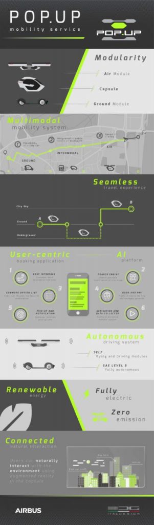 Concrètement (si tant est qu’on puisse utiliser ce terme) ? La capsule vient se greffer « sur un châssis en fibre de carbone équipé d’un moteur électrique » quand selon la densité plus forte du trafic elle « se déconnecte pour se placer sous un module aérien de 5 m par 4,4 m propulsé par huit rotors » complète Airbus.